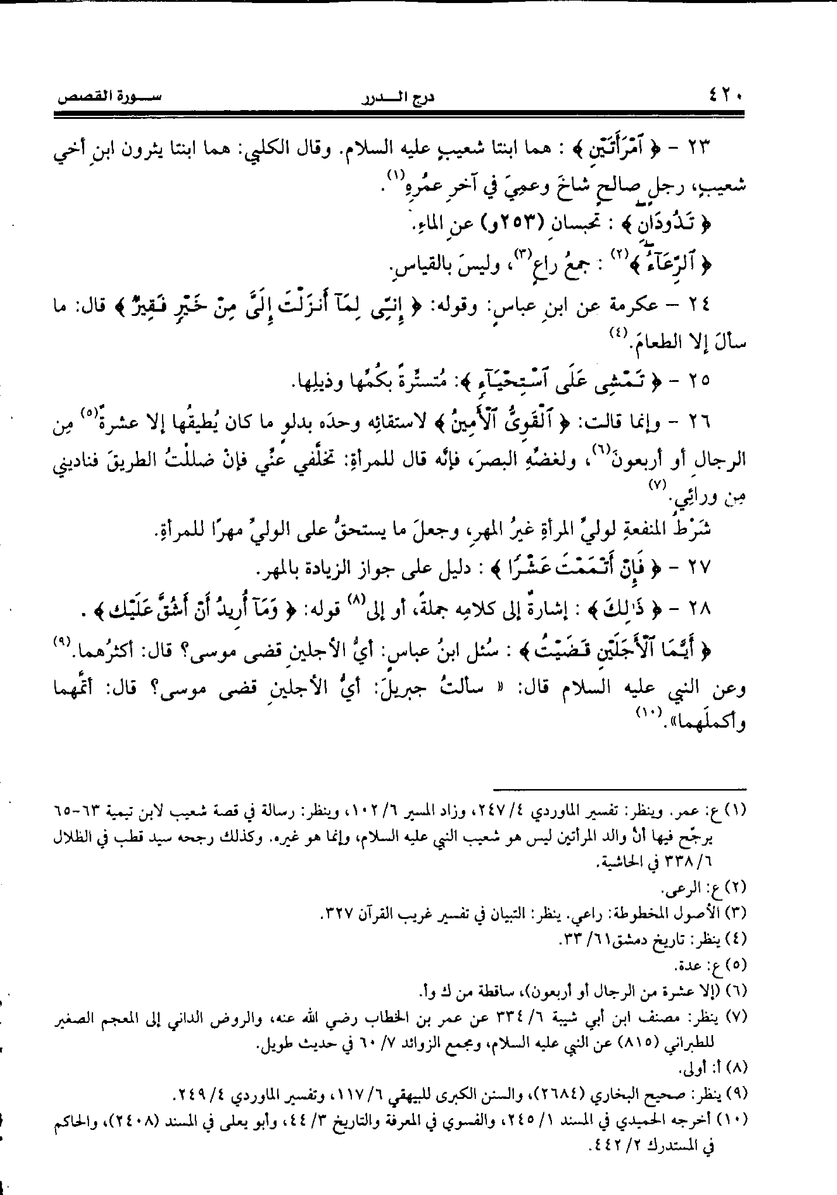(¬1) ع: عمر. وينظر: تفسير الماوردي 4/ 247، وزاد المسير 6/ 102، وينظر: رسالة في قصة شعيب لابن تيمية 63 - 65 يرجّح فيها أنّ والد المرأتين ليس هو شعيب النبي عليه السّلام، وإنما هو غيره. وكذلك رجحه سيد قطب في الظلال 6/ 338 في الحاشية.