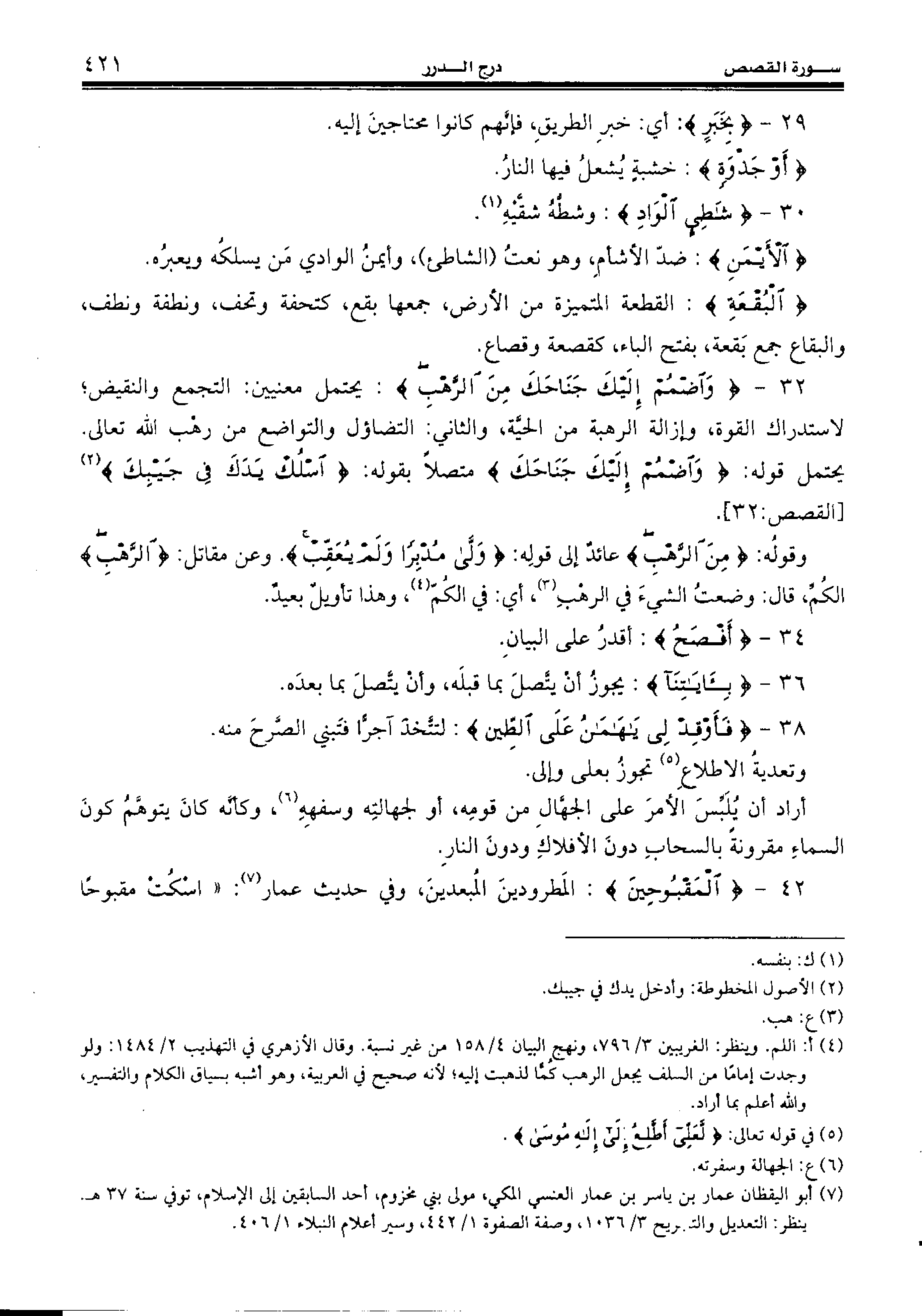 32 - {وَاُضْمُمْ إِلَيْكَ جَناحَكَ مِنَ الرَّهْبِ:} يحتمل معنيين: التجمع والنقيض؛ لاستدراك القوة، وإزالة الرهبة من الحيّة، والثاني: التضاؤل والتواضع من رهب الله تعالى.