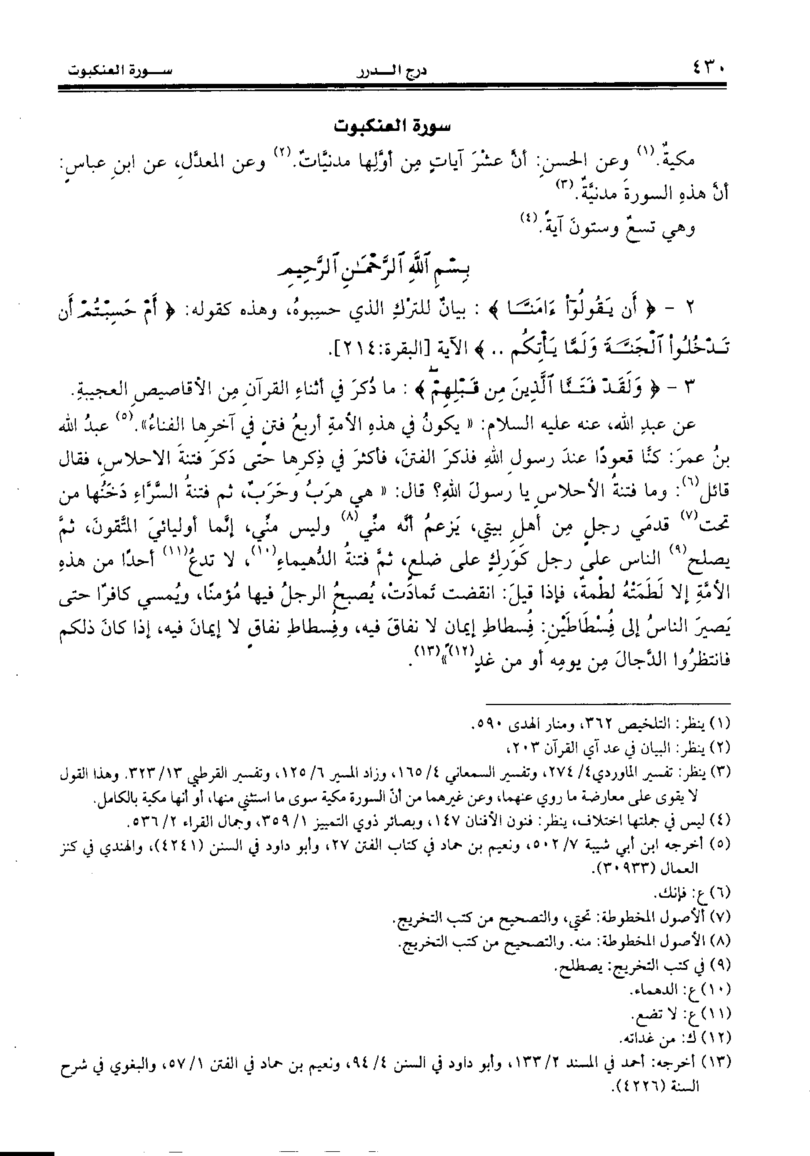(¬3) ينظر: تفسير الماوردي 4/ 274، وتفسير السمعاني 4/ 165، وزاد المسير 6/ 125، وتفسير القرطبي 13/ 323. وهذا القول لا يقوى على معارضة ما روي عنهما، وعن غيرهما من أنّ السورة مكية سوى ما استثني منها، أو أنها مكية بالكامل.