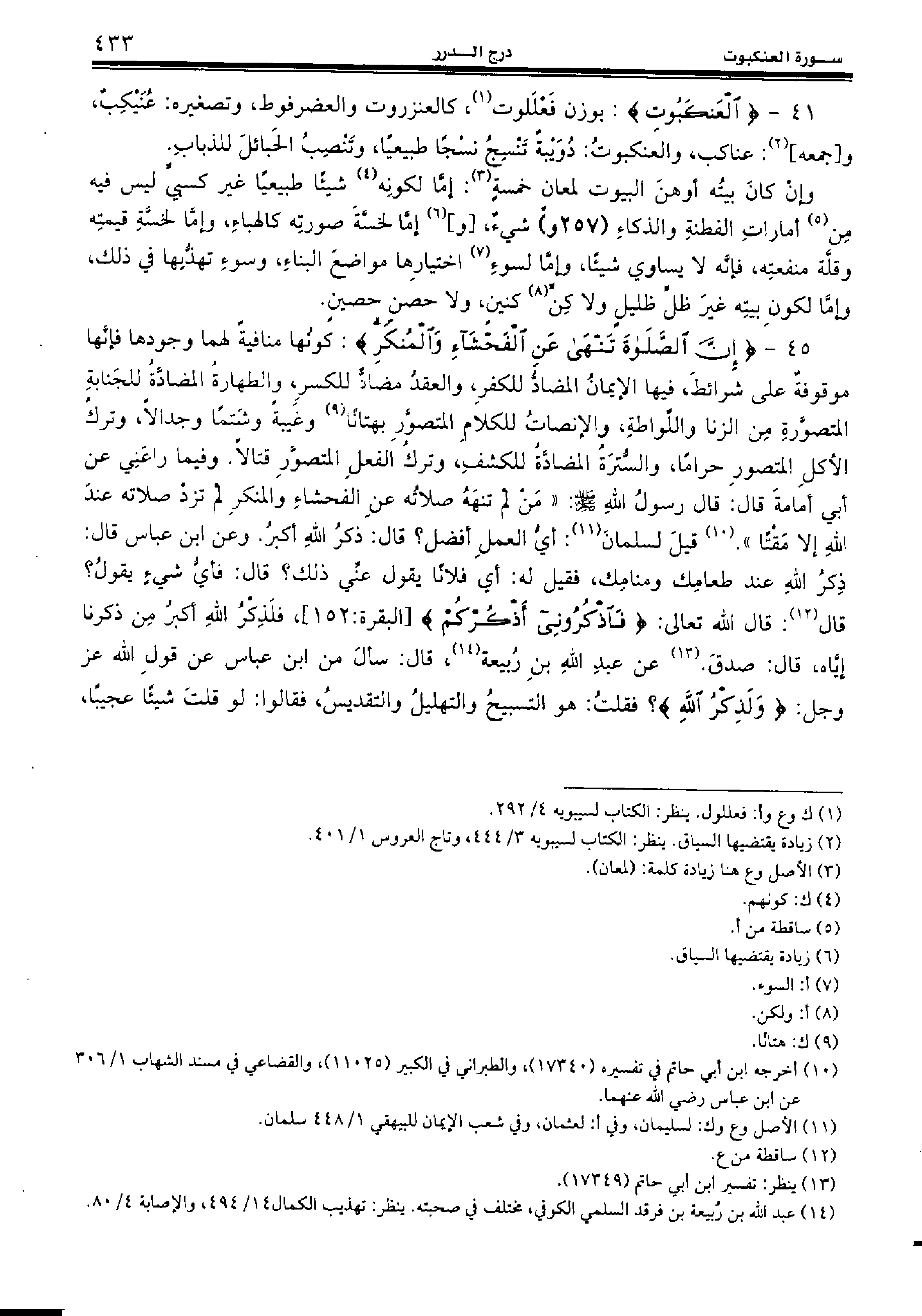 45 - {إِنَّ الصَّلاةَ تَنْهى عَنِ الْفَحْشاءِ وَالْمُنْكَرِ:} كونها منافية لهما وجودها فإنّها موقوفة على شرائط، فيها الإيمان المضادّ للكفر، والعقد مضادّ للكسر، والطهارة المضادّة للجنابة المتصوّرة من الزنا واللّواطة، والإنصات للكلام المتصوّر بهتانا (¬9) وغيبة وشتما وجدالا، وترك الأكل المتصور حراما، والسّترة المضادّة للكشف، وترك الفعل المتصوّر قتالا. وفيما راعني عن أبي أمامة قال: قال رسول الله صلّى الله عليه وسلّم: «من لم تنهه صلاته عن الفحشاء والمنكر لم تزد صلاته عند الله إلا مقتا». (¬10) قيل لسلمان (¬11): أيّ العمل أفضل؟ قال: ذكر الله أكبر. وعن ابن عباس قال: