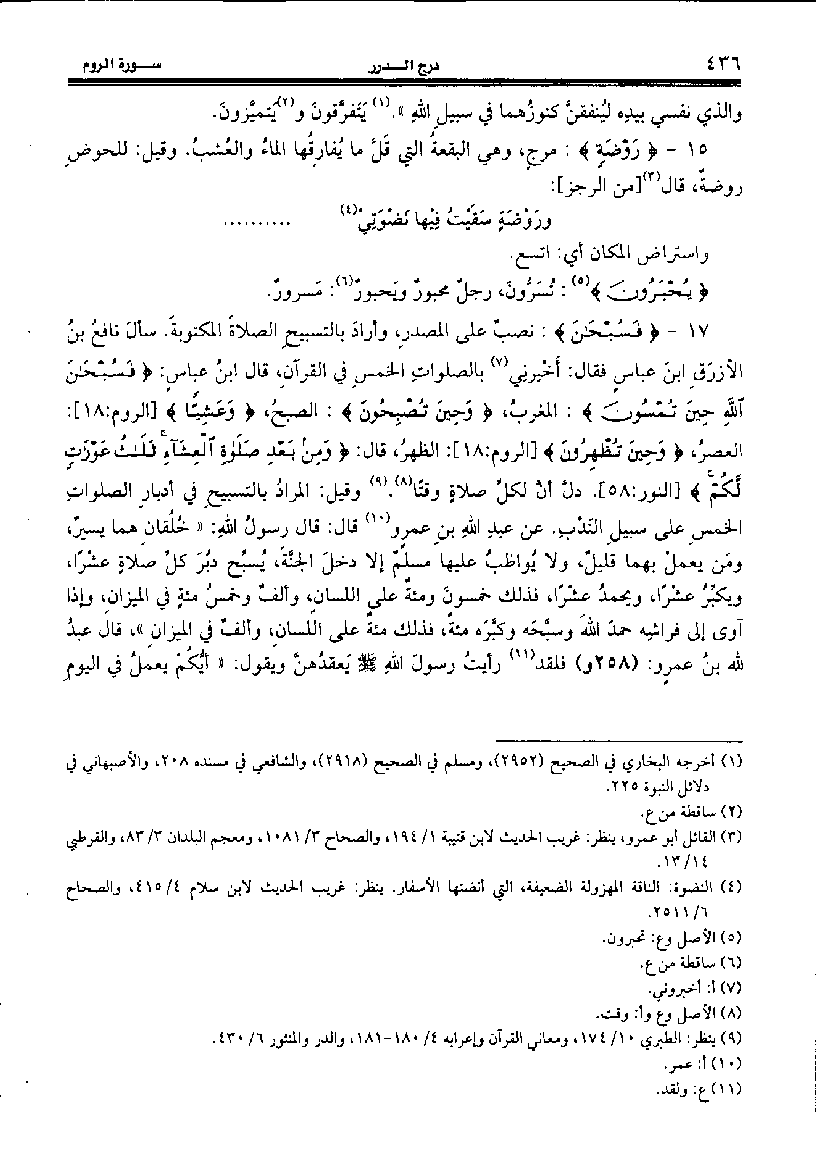 17 - {فَسُبْحانَ:} نصب على المصدر، وأراد بالتسبيح الصلاة المكتوبة. سأل نافع بن الأزرق ابن عباس فقال: أخبرني (¬7) بالصلوات الخمس في القرآن، قال ابن عباس: {فَسُبْحانَ اللهِ حِينَ تُمْسُونَ:} المغرب، {وَحِينَ تُصْبِحُونَ:} الصبح، {وَعَشِيًّا} [الروم:18]: