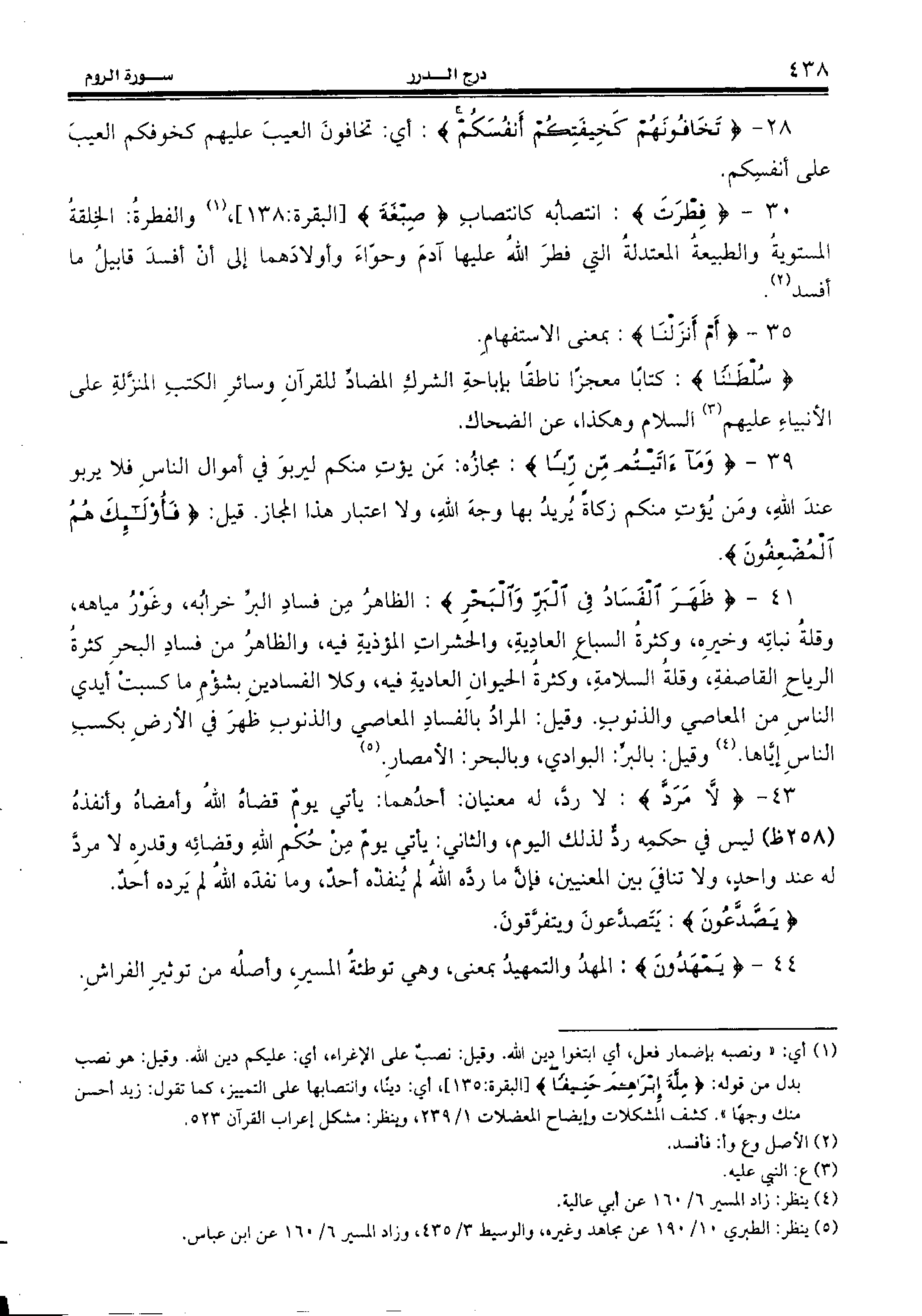 30 - {فِطْرَتَ:} انتصابه كانتصاب {صِبْغَةَ} [البقرة:138]، (¬1) والفطرة: الخلقة المستوية والطبيعة المعتدلة التي فطر الله عليها آدم وحوّاء وأولادهما إلى أن أفسد قابيل ما أفسد (¬2).
