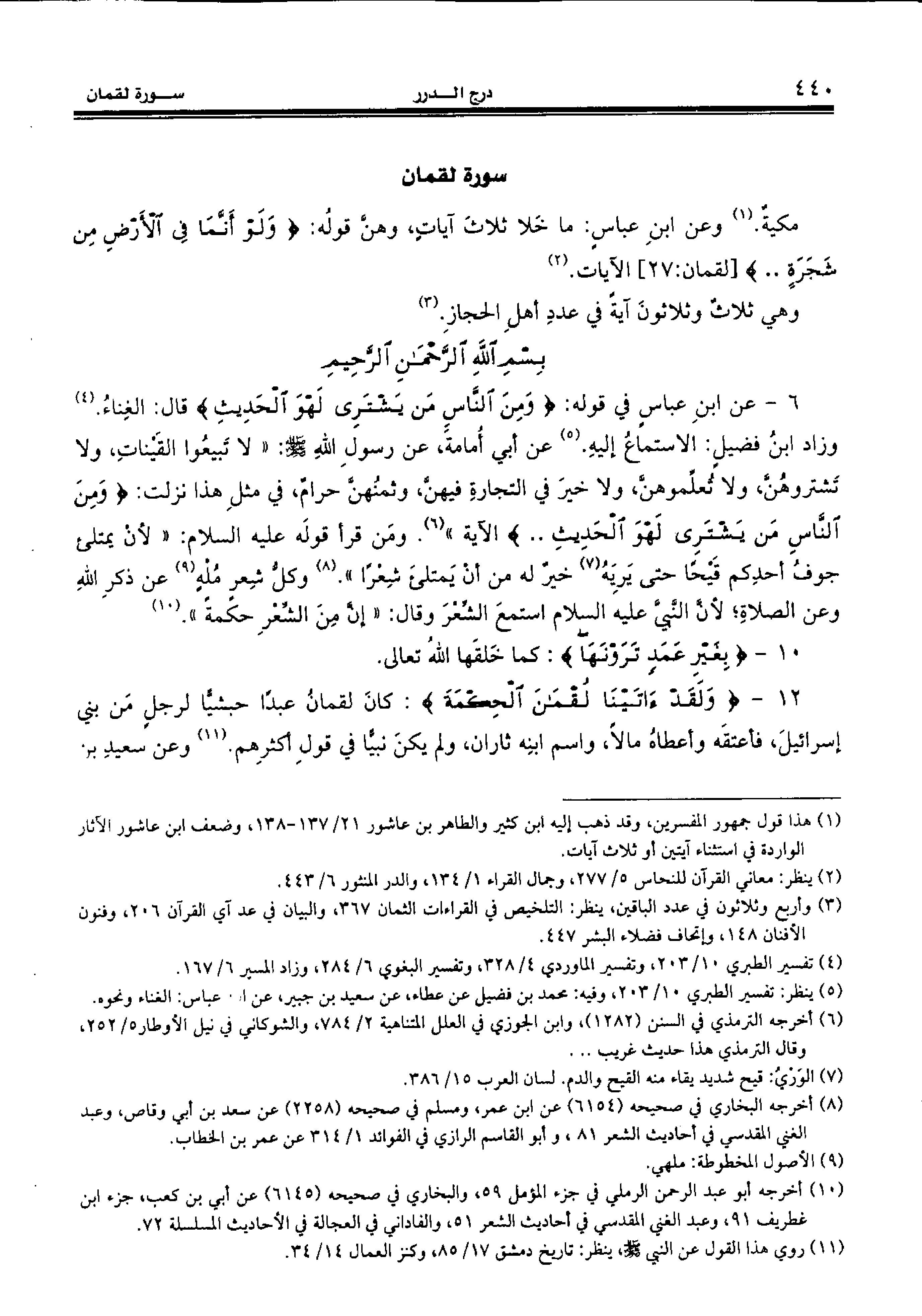 بسم الله الرّحمن الرّحيم 6 - عن ابن عباس في قوله: {وَمِنَ النّاسِ مَنْ يَشْتَرِي لَهْوَ الْحَدِيثِ} قال: الغناء. (¬4)