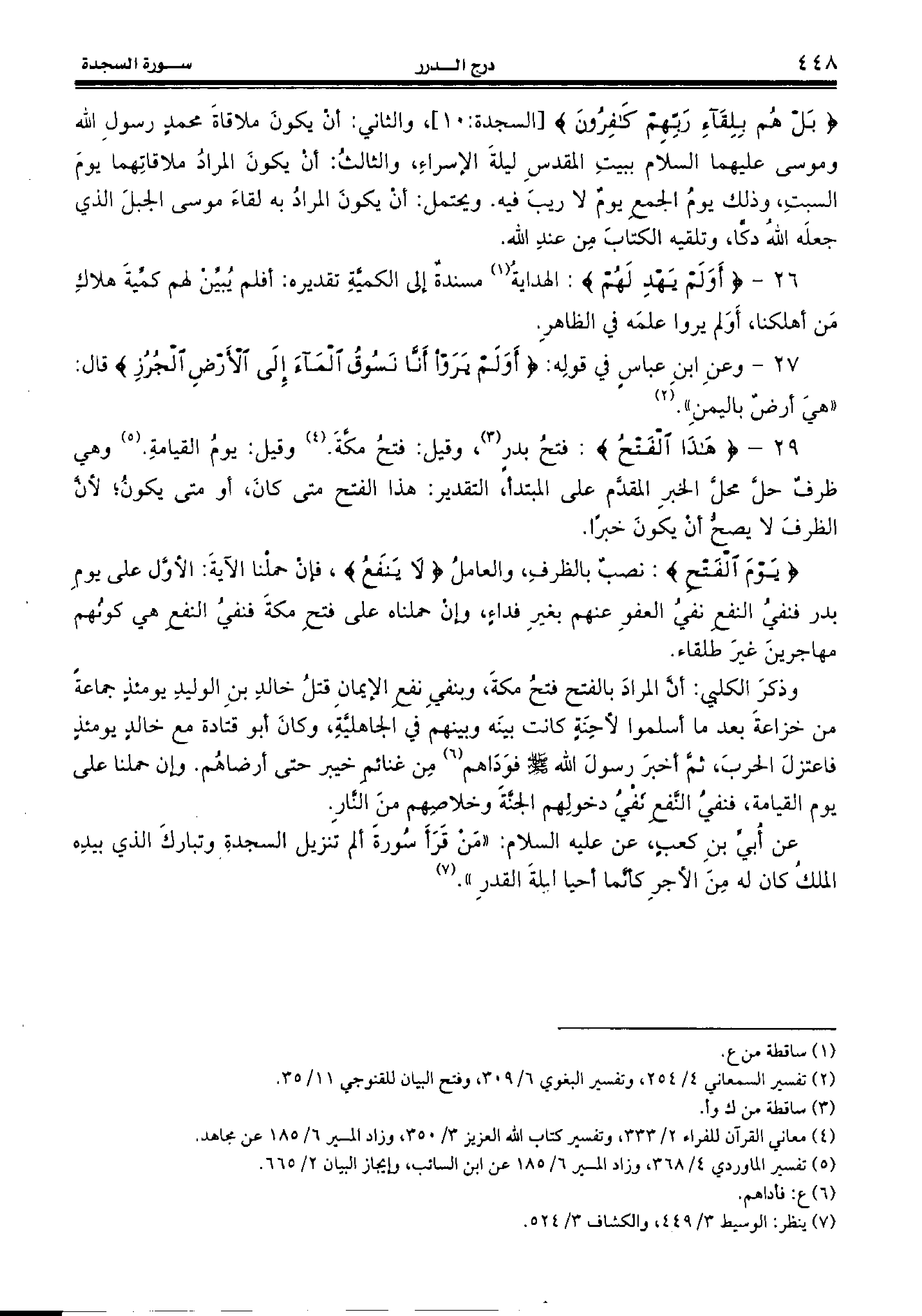 وذكر الكلبي: أنّ المراد بالفتح فتح مكة، وبنفي نفع الإيمان قتل خالد بن الوليد يومئذ جماعة من خزاعة بعد ما أسلموا لأحنة كانت بينه وبينهم في الجاهليّة، وكان أبو قتادة مع خالد يومئذ فاعتزل الحرب، ثمّ أخبر رسول الله صلّى الله عليه وسلّم فوداهم (¬6) من غنائم خيبر حتى أرضاهم. وإن حملنا على يوم القيامة، فنفي النّفع نفي دخولهم الجنّة وخلاصهم من النّار.