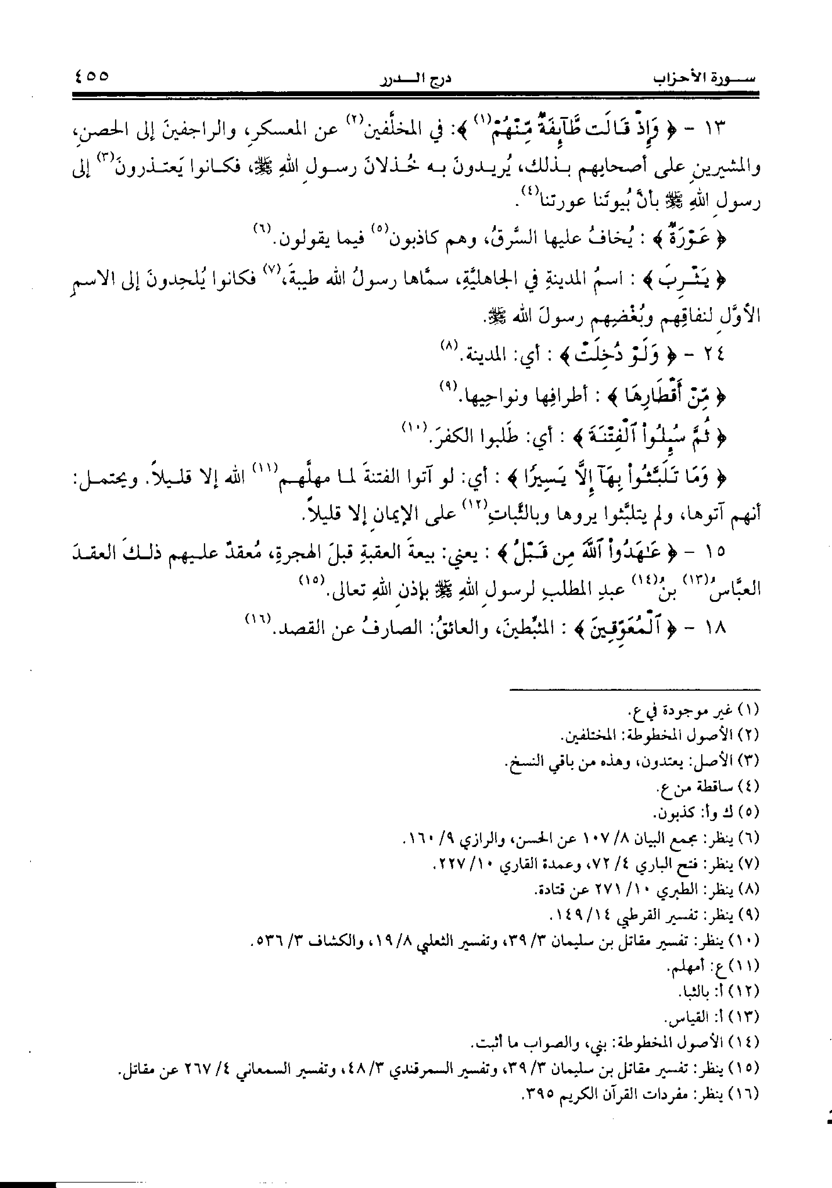 13 - {وَإِذْ قالَتْ طائِفَةٌ مِنْهُمْ} (¬1): في المخلّفين (¬2) عن المعسكر، والراجفين إلى الحصن، والمشيرين على أصحابهم بذلك، يريدون به خذلان رسول الله صلّى الله عليه وسلّم، فكانوا يعتذرون (¬3) إلى رسول الله صلّى الله عليه وسلّم بأنّ بيوتنا عورتنا (¬4).