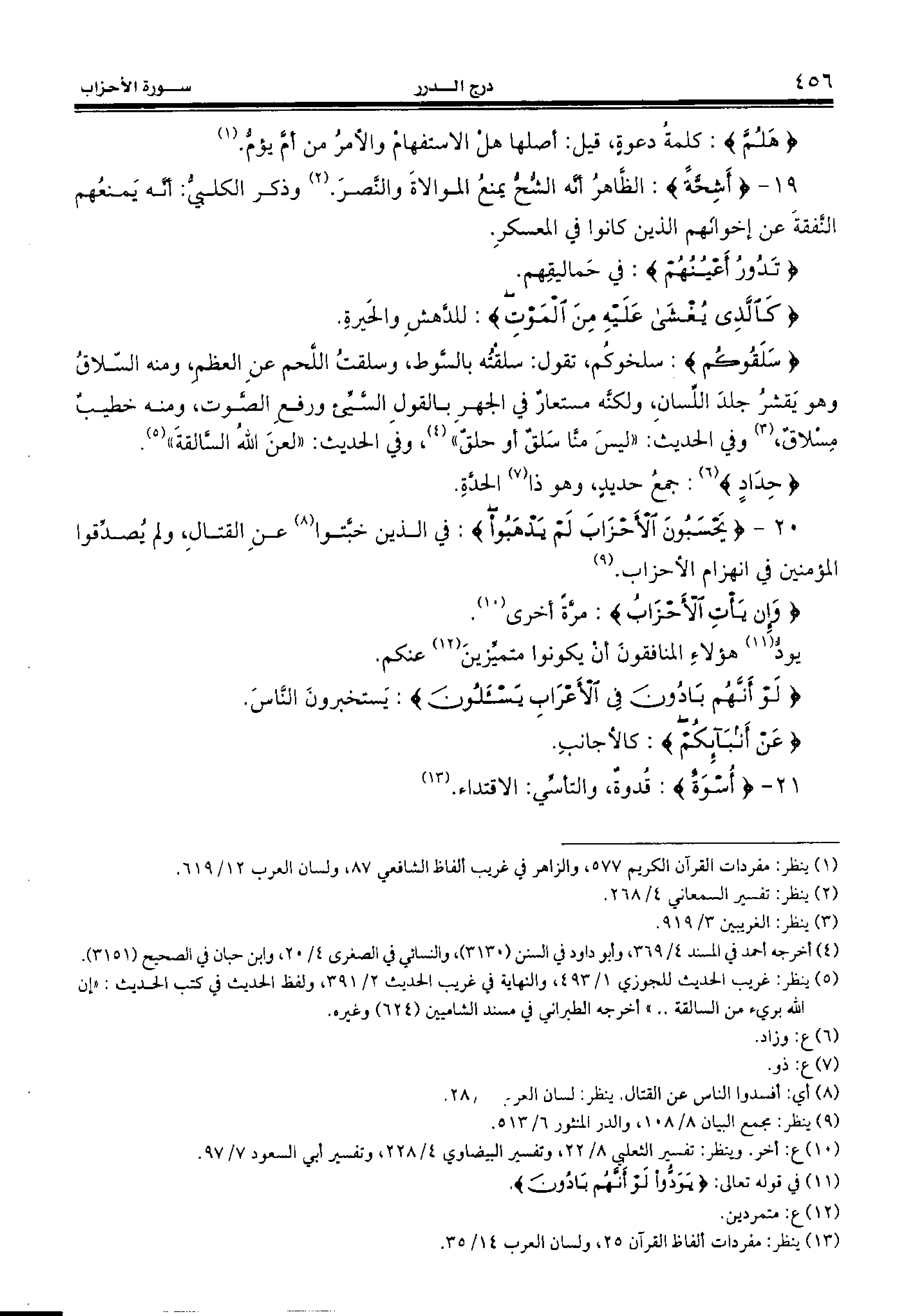 19 - {أَشِحَّةً:} الظّاهر أنّه الشّحّ يمنع الموالاة والنّصر. (¬2) وذكر الكلبيّ: أنّه يمنعهم النّفقة عن إخوانهم الذين كانوا في المعسكر.