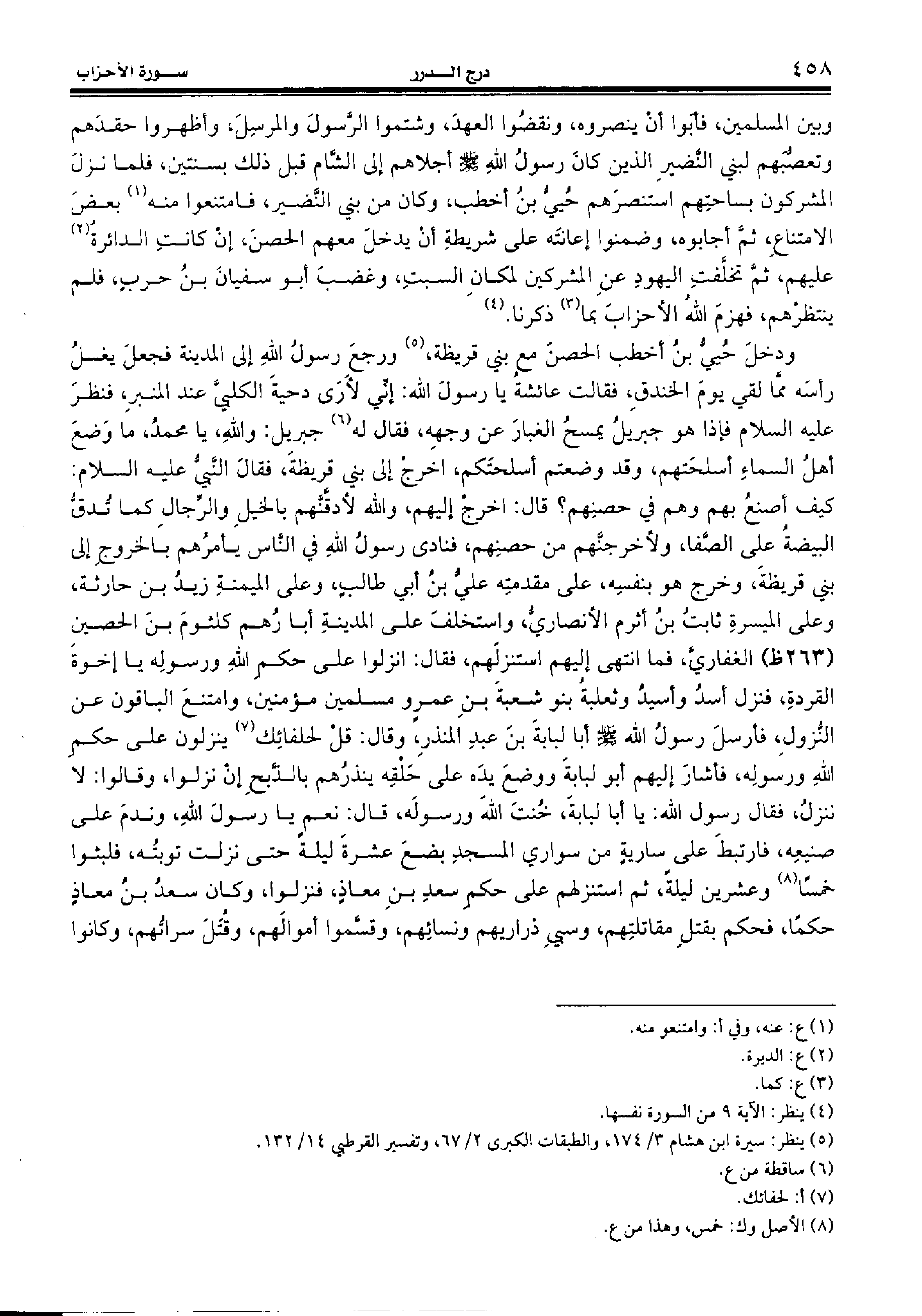 وبين المسلمين، فأبوا أن ينصروه، ونقضوا العهد، وشتموا الرّسول والمرسل، وأظهروا حقدهم وتعصّبهم لبني النّضير الذين كان رسول الله صلّى الله عليه وسلّم أجلاهم إلى الشّام قبل ذلك بسنتين، فلما نزل المشركون بساحتهم استنصرهم حييّ بن أخطب، وكان من بني النّضير، فامتنعوا منه (¬1) بعض الامتناع، ثمّ أجابوه، وضمنوا إعانته على شريطة أن يدخل معهم الحصن، إن كانت الدائرة (¬2) عليهم، ثمّ تخلّفت اليهود عن المشركين لمكان السبت، وغضب أبو سفيان بن حرب، فلم ينتظرهم، فهزم الله الأحزاب بما (¬3) ذكرنا. (¬4)