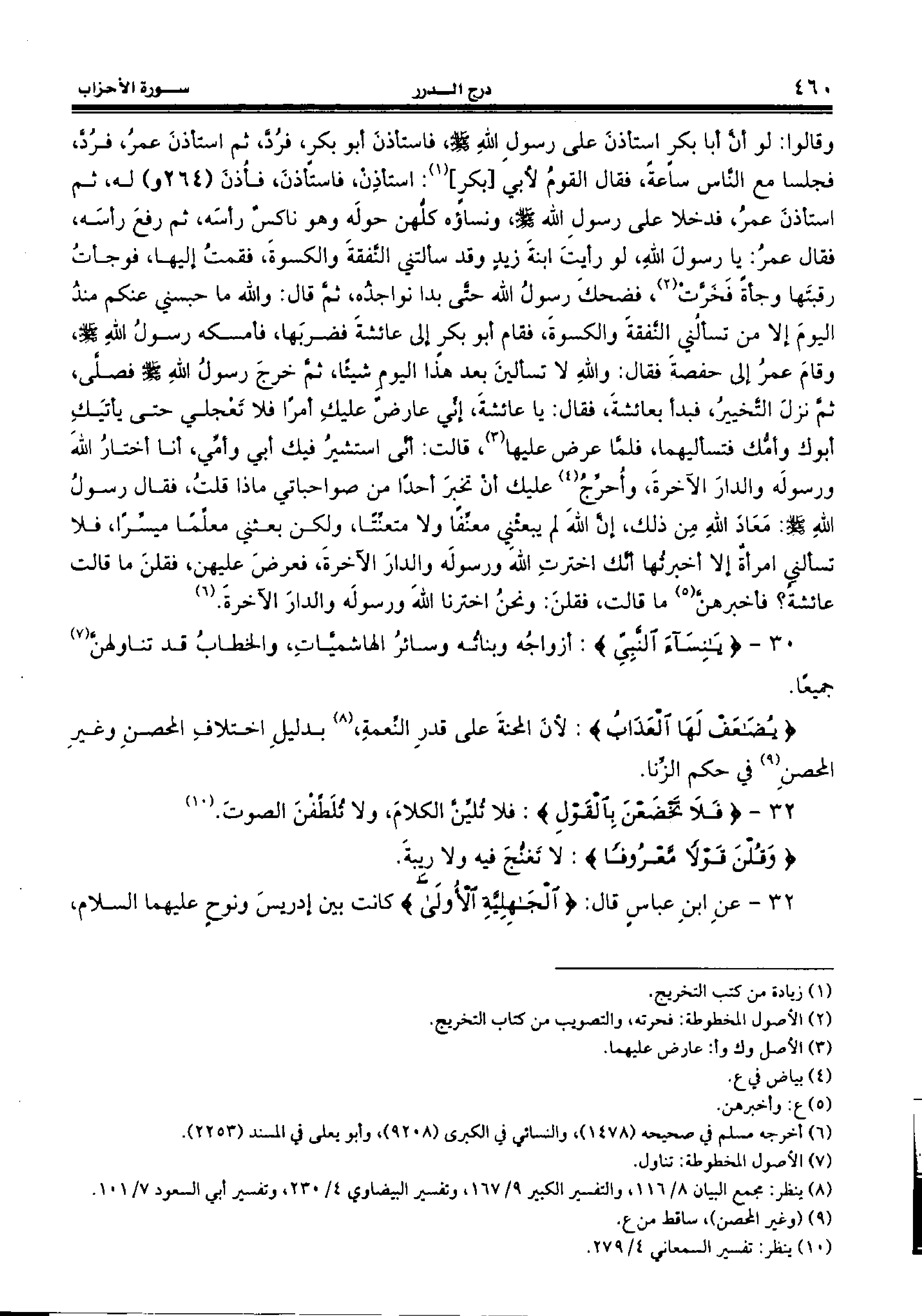 وقالوا: لو أنّ أبا بكر استأذن على رسول الله صلّى الله عليه وسلّم، فاستأذن أبو بكر، فردّ، ثم استأذن عمر، فردّ، فجلسا مع النّاس ساعة، فقال القوم لأبي [بكر] (¬1): استأذن، فاستأذن، فأذن (264 و) له، ثم استأذن عمر، فدخلا على رسول الله صلّى الله عليه وسلّم، ونساؤه كلّهن حوله وهو ناكس رأسه، ثم رفع رأسه، فقال عمر: يا رسول الله، لو رأيت ابنة زيد وقد سألتني النّفقة والكسوة، فقمت إليها، فوجأت رقبتها وجأة فخرّت (¬2)، فضحك رسول الله حتّى بدا نواجذه، ثمّ قال: والله ما حبسني عنكم منذ اليوم إلا من تسألني النّفقة والكسوة، فقام أبو بكر إلى عائشة فضربها، فأمسكه رسول الله صلّى الله عليه وسلّم، وقام عمر إلى حفصة فقال: والله لا تسألين بعد هذا اليوم شيئا، ثمّ خرج رسول الله صلّى الله عليه وسلّم فصلّى، ثمّ نزل التّخيير، فبدأ بعائشة، فقال: يا عائشة، إنّي عارض عليك أمرا فلا تعجلي حتى يأتيك أبوك وأمّك فتسأليهما، فلمّا عرض عليها (¬3)، قالت: أنّى استشير فيك أبي وأمّي، أنا أختار الله ورسوله والدار الآخرة، وأحرّج (¬4) عليك أن تخبر أحدا من صواحباتي ماذا قلت، فقال رسول الله صلّى الله عليه وسلّم: معاذ الله من ذلك، إنّ الله لم يبعثني معنّفا ولا متعنّتا، ولكن بعثني معلّما ميسّرا، فلا تسألني امرأة إلا أخبرتها أنّك اخترت الله ورسوله والدار الآخرة، فعرض عليهن، فقلن ما قالت عائشة؟ فأخبرهنّ (¬5) ما قالت، فقلن: ونحن اخترنا الله ورسوله والدار الآخرة. (¬6)