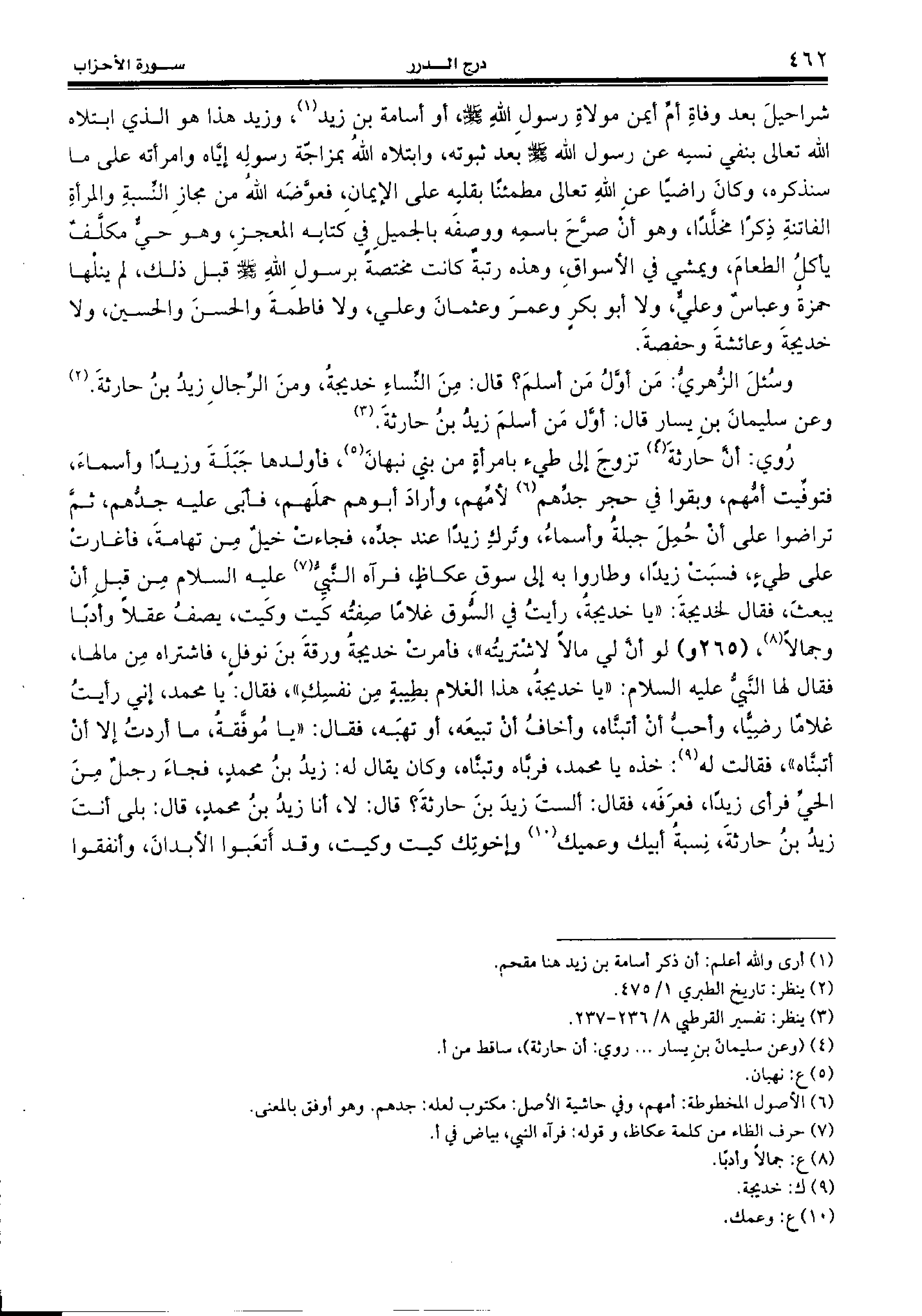روي: أنّ حارثة (¬4) تزوج إلى طيء بامرأة من بني نبهان (¬5)، فأولدها جبلة وزيدا وأسماء، فتوفّيت أمّهم، وبقوا في حجر جدّهم (¬6) لأمّهم، وأراد أبوهم حملهم، فأبى عليه جدّهم، ثمّ تراضوا على أن حمل جبلة وأسماء، وترك زيدا عند جدّه، فجاءت خيل من تهامة، فأغارت على طيء، فسبت زيدا، وطاروا به إلى سوق عكاظ، فرآه النّبيّ (¬7) عليه السّلام من قبل أن يبعث، فقال لخديجة: «يا خديجة، رأيت في السّوق غلاما صفته كيت وكيت، يصف عقلا وأدبا وجمالا (¬8)، (265 و) لو أنّ لي مالا لاشتريته»، فأمرت خديجة ورقة بن نوفل، فاشتراه من مالها، فقال لها النّبيّ عليه السّلام: «يا خديجة، هذا الغلام بطيبة من نفسك»، فقال: يا محمد، إني رأيت غلاما رضيّا، وأحبّ أن أتبنّاه، وأخاف أن تبيعه، أو تهبه، فقال: «يا موفّقة، ما أردت إلا أن أتبنّاه»، فقالت له (¬9): خذه يا محمد، فربّاه وتبنّاه، وكان يقال له: زيد بن محمد، فجاء رجل من الحيّ فرأى زيدا، فعرفه، فقال: ألست زيد بن حارثة؟ قال: لا، أنا زيد بن محمد، قال: بلى أنت زيد بن حارثة، نسبة أبيك وعميك (¬10) وإخوتك كيت وكيت، وقد أتعبوا الأبدان، وأنفقوا