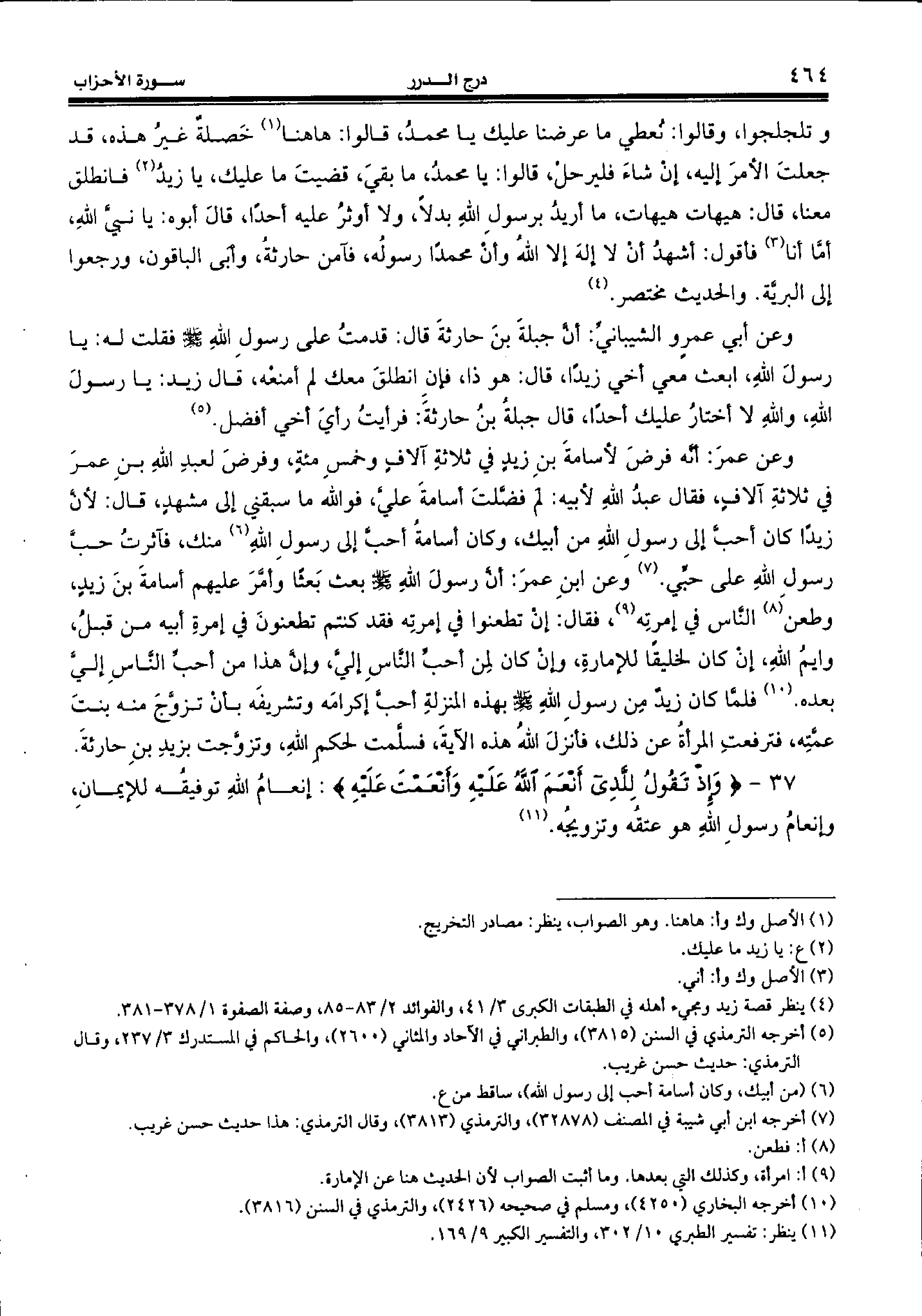 37 - {وَإِذْ تَقُولُ لِلَّذِي أَنْعَمَ اللهُ عَلَيْهِ وَأَنْعَمْتَ عَلَيْهِ:} إنعام الله توفيقه للإيمان، وإنعام رسول الله هو عتقه وتزويجه. (¬11)
