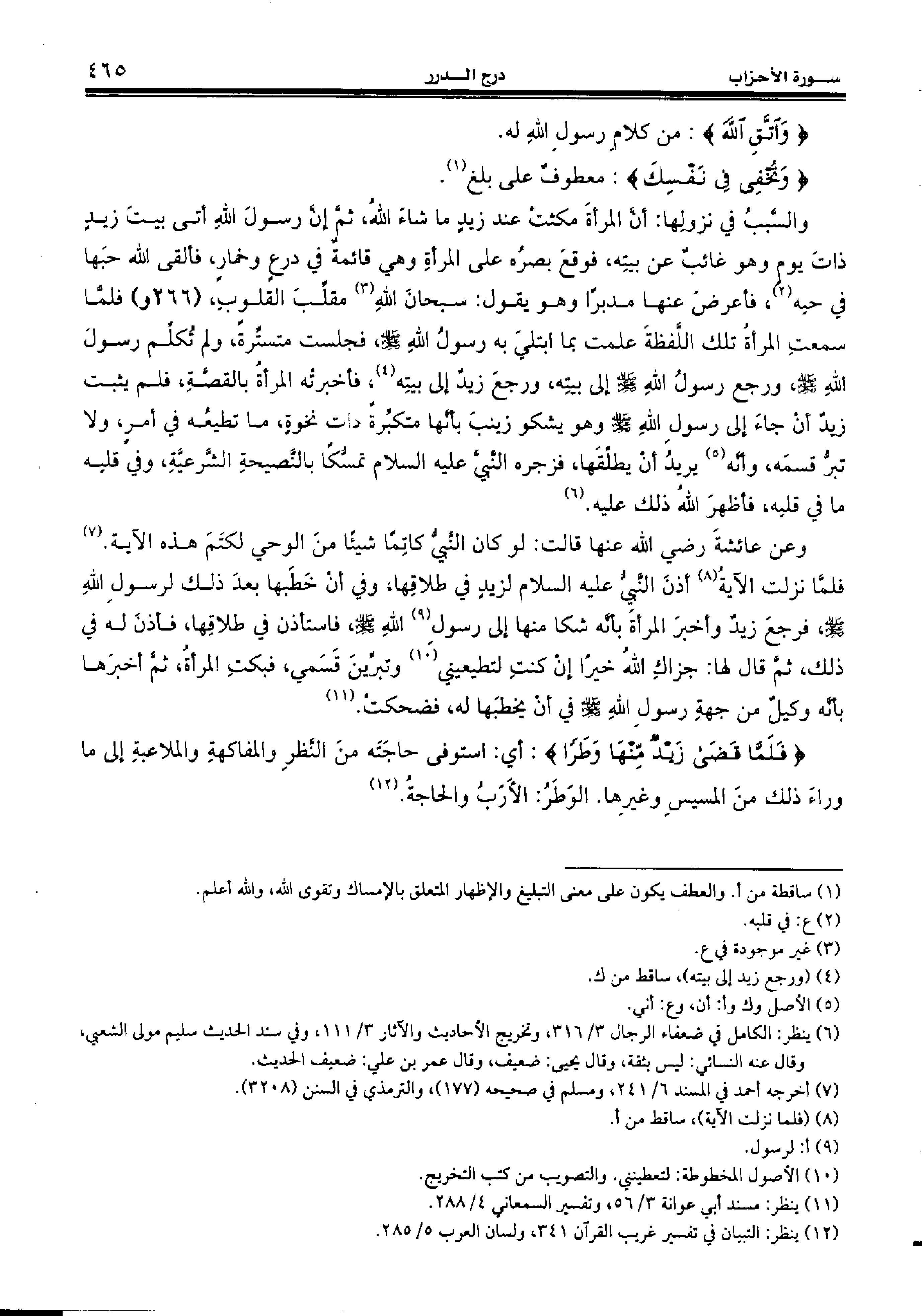 والسّبب في نزولها: أنّ المرأة مكثت عند زيد ما شاء الله، ثمّ إنّ رسول الله أتى بيت زيد ذات يوم وهو غائب عن بيته، فوقع بصره على المرأة وهي قائمة في درع وخمار، فألقى الله حبها في حبه (¬2)، فأعرض عنها مدبرا وهو يقول: سبحان الله (¬3) مقلّب القلوب، (266 و) فلمّا سمعت المرأة تلك اللّفظة علمت بما ابتلي به رسول الله صلّى الله عليه وسلّم، فجلست متستّرة، ولم تكلّم رسول الله صلّى الله عليه وسلّم، ورجع رسول الله صلّى الله عليه وسلّم إلى بيته، ورجع زيد إلى بيته (¬4)، فأخبرته المرأة بالقصّة، فلم يثبت زيد أن جاء إلى رسول الله صلّى الله عليه وسلّم وهو يشكو زينب بأنّها متكبّرة ذات نخوة، ما تطيعه في أمر، ولا تبرّ قسمه، وأنّه (¬5) يريد أن يطلّقها، فزجره النّبيّ عليه السّلام تمسّكا بالنّصيحة الشّرعيّة، وفي قلبه ما في قلبه، فأظهر الله ذلك عليه. (¬6)
