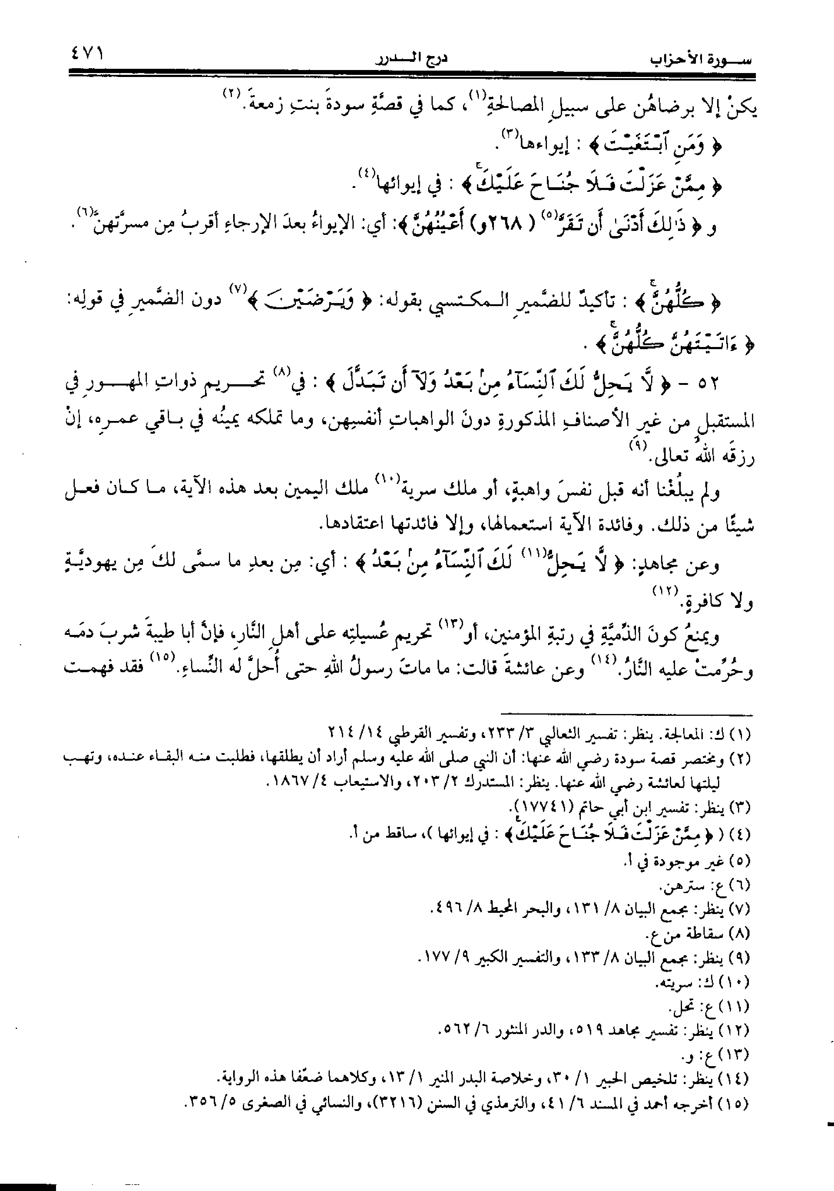 52 - {لا يَحِلُّ لَكَ النِّساءُ مِنْ بَعْدُ وَلا أَنْ تَبَدَّلَ:} في (¬8) تحريم ذوات المهور في المستقبل من غير الأصناف المذكورة دون الواهبات أنفسهن، وما تملكه يمينه في باقي عمره، إن رزقه الله تعالى. (¬9)