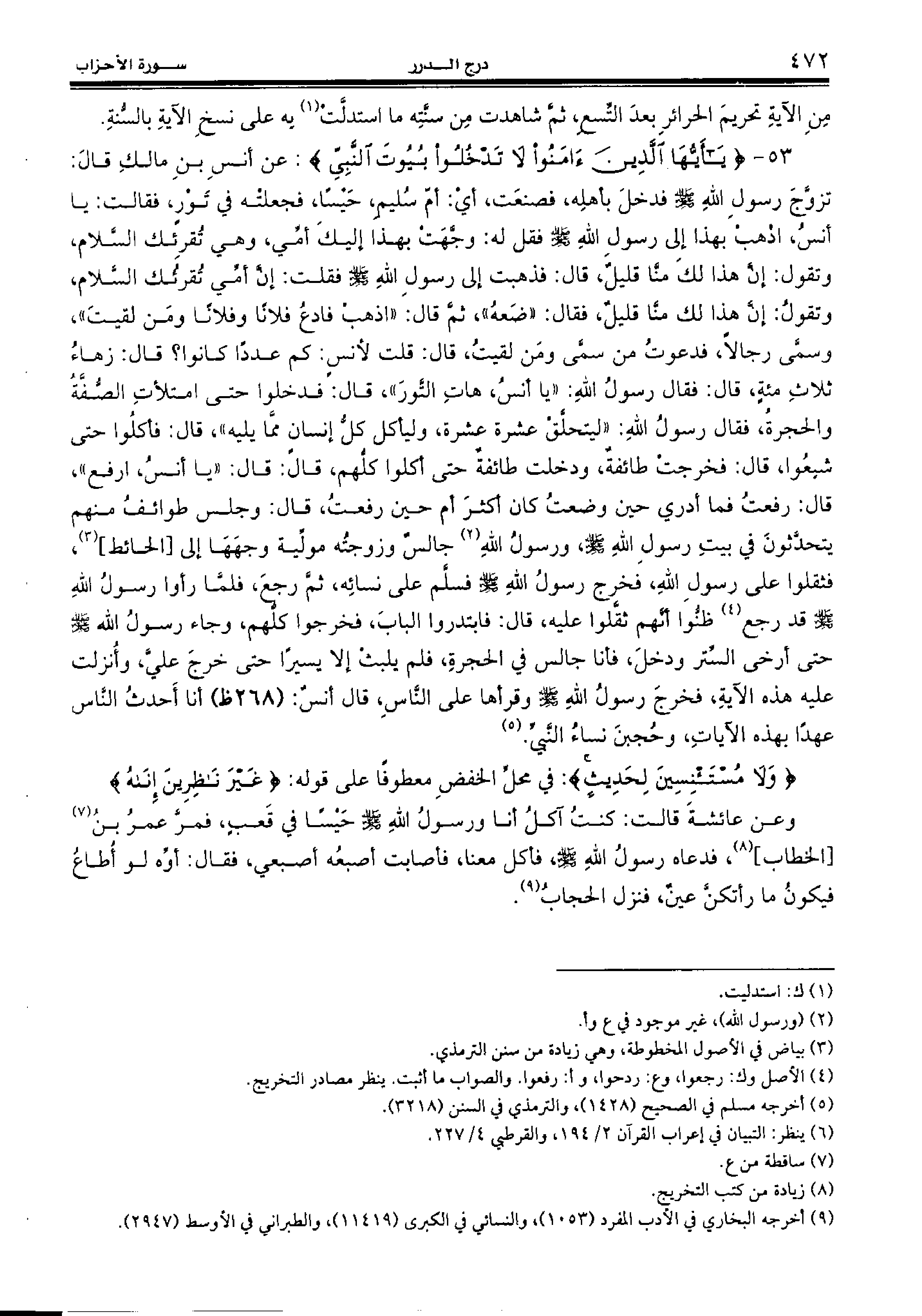 تزوّج رسول الله صلّى الله عليه وسلّم فدخل بأهله، فصنعت، أي: أمّ سليم، حيسا، فجعلته في تور، فقالت: يا أنس، اذهب بهذا إلى رسول الله صلّى الله عليه وسلّم فقل له: وجّهت بهذا إليك أمّي، وهي تقرئك السّلام، وتقول: إنّ هذا لك منّا قليل، قال: فذهبت إلى رسول الله صلّى الله عليه وسلّم فقلت: إنّ أمّي تقرئك السّلام، وتقول: إنّ هذا لك منّا قليل، فقال: «ضعه»، ثمّ قال: «اذهب فادع فلانا وفلانا ومن لقيت»، وسمّى رجالا، فدعوت من سمّى ومن لقيت، قال: قلت لأنس: كم عددا كانوا؟ قال: زهاء ثلاث مئة، قال: فقال رسول الله: «يا أنس، هات التّور»، قال: فدخلوا حتى امتلأت الصّفّة والحجرة، فقال رسول الله: «ليتحلّق عشرة عشرة، وليأكل كلّ إنسان ممّا يليه»، قال: فأكلوا حتى شبعوا، قال: فخرجت طائفة، ودخلت طائفة حتى أكلوا كلّهم، قال: قال: «يا أنس، ارفع»، قال: رفعت فما أدري حين وضعت كان أكثر أم حين رفعت، قال: وجلس طوائف منهم يتحدّثون في بيت رسول الله صلّى الله عليه وسلّم، ورسول الله (¬2) جالس وزوجته مولّية وجهها إلى [الحائط] (¬3)، فثقلوا على رسول الله، فخرج رسول الله صلّى الله عليه وسلّم فسلّم على نسائه، ثمّ رجع، فلمّا رأوا رسول الله صلّى الله عليه وسلّم قد رجع (¬4) ظنّوا أنّهم ثقّلوا عليه، قال: فابتدروا الباب، فخرجوا كلّهم، وجاء رسول الله صلّى الله عليه وسلّم حتى أرخى السّتر ودخل، فأنا جالس في الحجرة، فلم يلبث إلا يسيرا حتى خرج عليّ، وأنزلت عليه هذه الآية، فخرج رسول الله صلّى الله عليه وسلّم وقرأها على النّاس، قال أنس: (268 ظ) أنا أحدث النّاس عهدا بهذه الآيات، وحجبن نساء النّبيّ. (¬5)