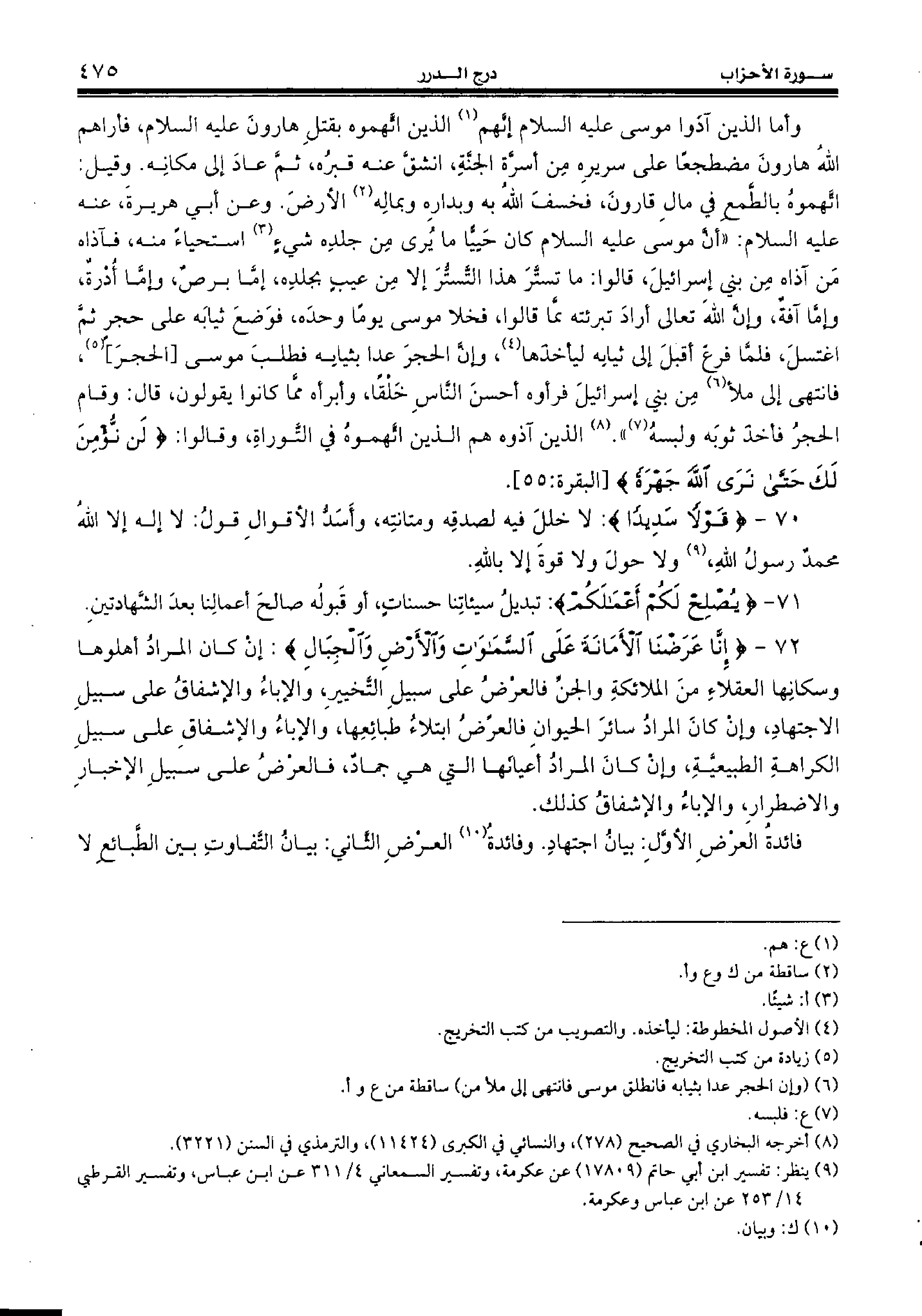 اتّهموه بالطّمع في مال قارون، فخسف الله به وبداره وبماله (¬2) الأرض. وعن أبي هريرة، عنه عليه السّلام: «أنّ موسى عليه السّلام كان حييّا ما يرى من جلده شيء (¬3) استحياء منه، فآذاه من آذاه من بني إسرائيل، قالوا: ما تستّر هذا التّستّر إلا من عيب بجلده، إمّا برص، وإمّا أدرة، وإمّا آفة، وإنّ الله تعالى أراد تبرئته ممّا قالوا، فخلا موسى يوما وحده، فوضع ثيابه على حجر ثمّ اغتسل، فلمّا فرغ أقبل إلى ثيابه ليأخذها (¬4)، وإنّ الحجر عدا بثيابه فطلب موسى [الحجر] (¬5)، فانتهى إلى ملأ (¬6) من بني إسرائيل فرأوه أحسن النّاس خلقا، وأبرأه ممّا كانوا يقولون، قال: وقام الحجر فأخذ ثوبه ولبسه (¬7)». (¬8) الذين آذوه هم الذين اتّهموه في التّوراة، وقالوا: {لَنْ نُؤْمِنَ لَكَ حَتّى نَرَى اللهَ جَهْرَةً} [البقرة:55].