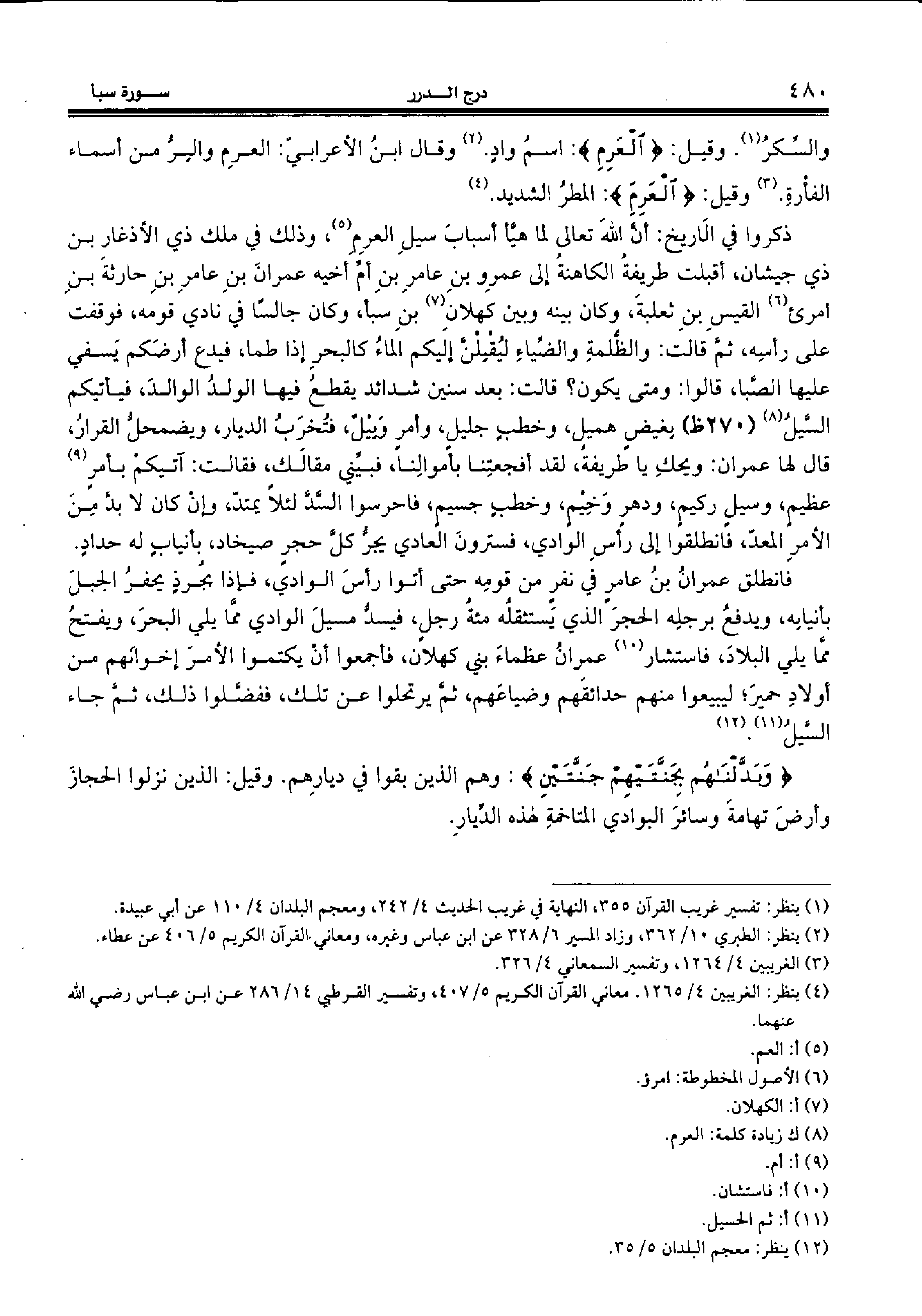 والسّكر (¬1). وقيل: {الْعَرِمِ:} اسم واد. (¬2) وقال ابن الأعرابيّ: العرم والبرّ من أسماء الفأرة. (¬3) وقيل: {الْعَرِمِ:} المطر الشديد. (¬4)