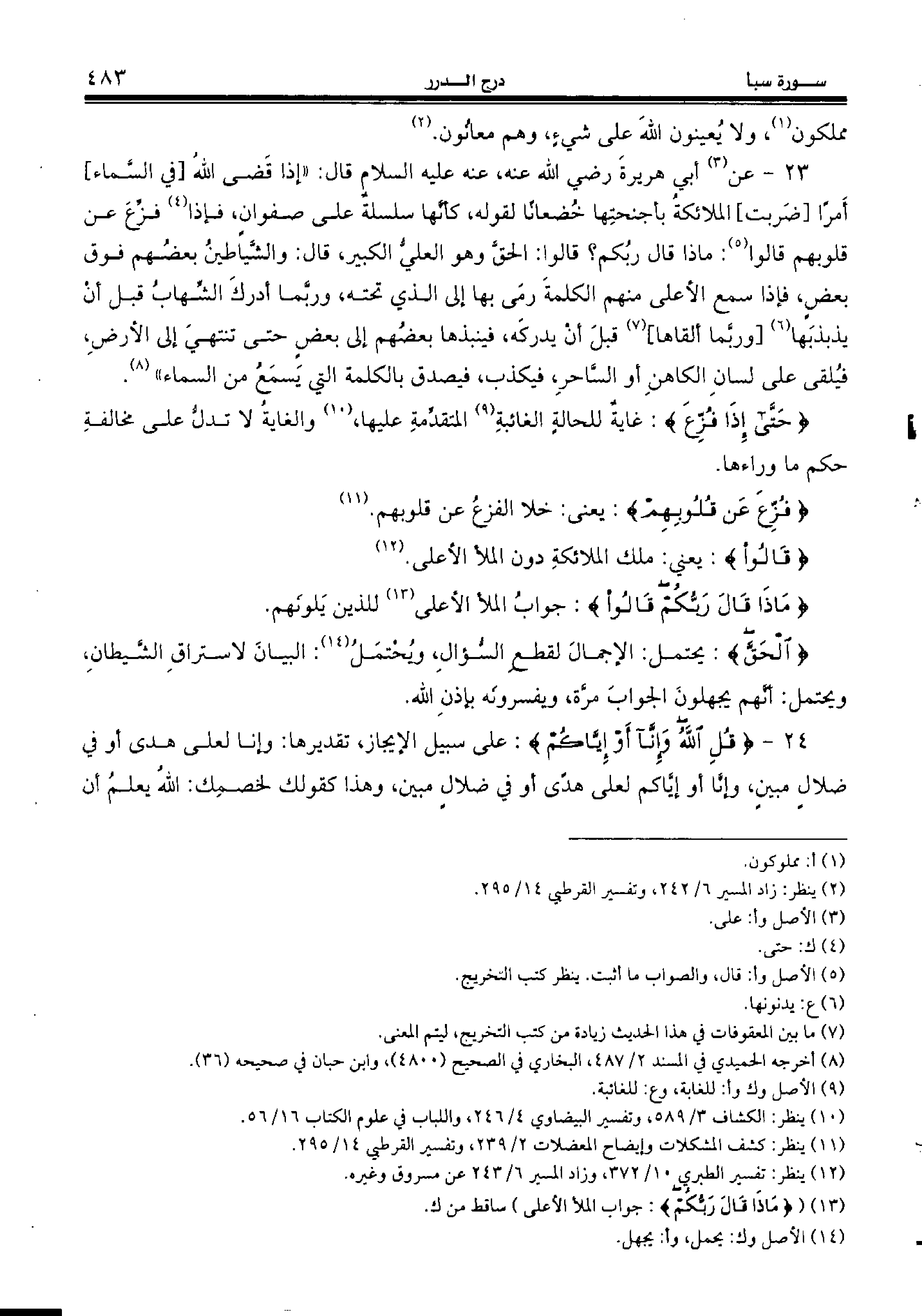 23 - عن (¬3) أبي هريرة رضي الله عنه، عنه عليه السّلام قال: «إذا قضى الله [في السّماء] أمرا [ضربت] الملائكة بأجنحتها خضعانا لقوله، كأنّها سلسلة على صفوان، فإذا (¬4) فزّع عن قلوبهم قالوا (¬5): ماذا قال ربكم؟ قالوا: الحقّ وهو العليّ الكبير، قال: والشّياطين بعضهم فوق بعض، فإذا سمع الأعلى منهم الكلمة رمى بها إلى الذي تحته، وربّما أدرك الشّهاب قبل أن يذبذبها (¬6) [وربّما ألقاها] (¬7) قبل أن يدركه، فينبذها بعضهم إلى بعض حتى تنتهي إلى الأرض، فيلقى على لسان الكاهن أو السّاحر، فيكذب، فيصدق بالكلمة التي يسمع من السماء» (¬8).