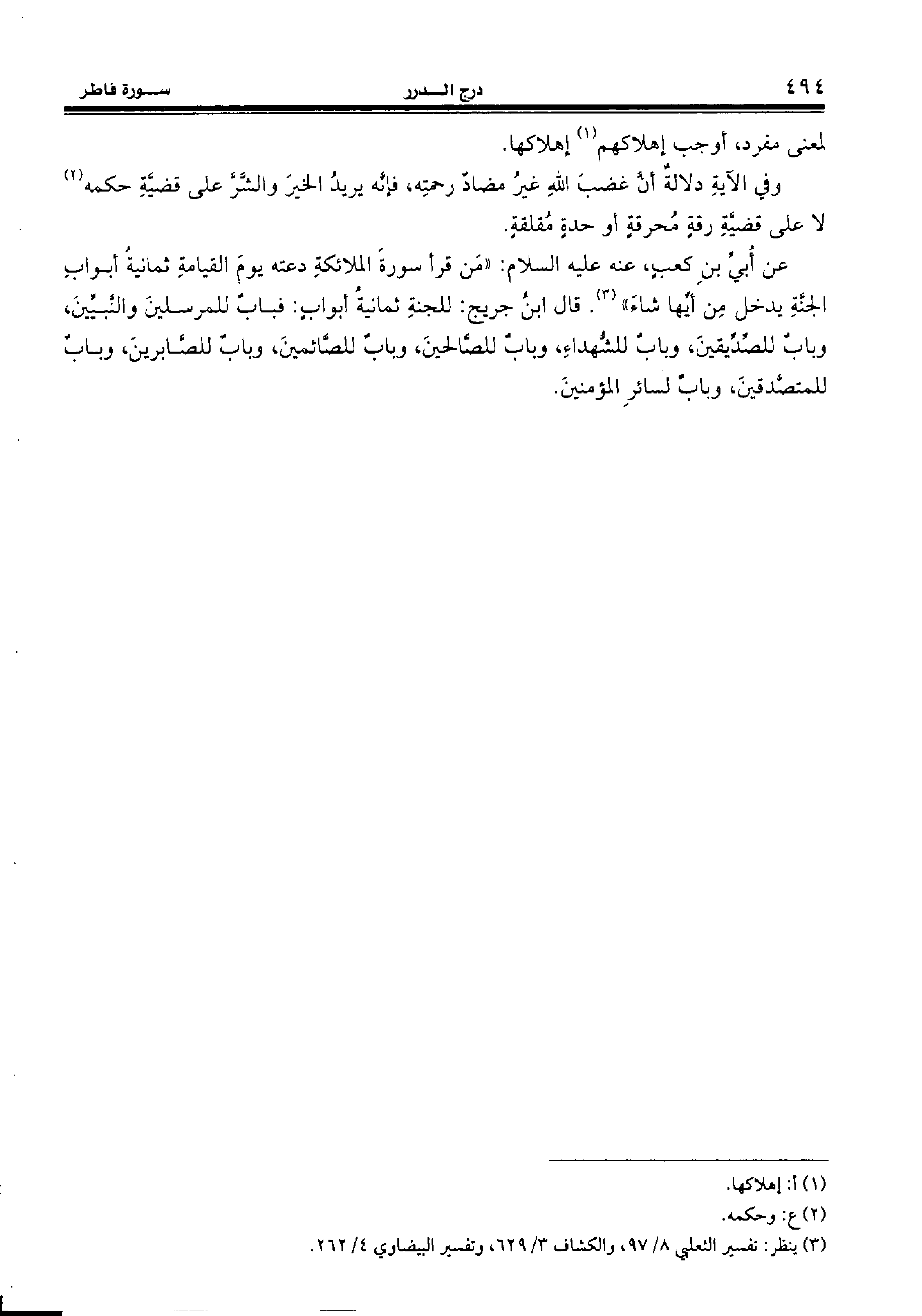 عن أبيّ بن كعب، عنه عليه السّلام: «من قرأ سورة الملائكة دعته يوم القيامة ثمانية أبواب الجنّة يدخل من أيّها شاء» (¬3). قال ابن جريج: للجنة ثمانية أبواب: فباب للمرسلين والنّبيّين، وباب للصّدّيقين، وباب للشّهداء، وباب للصّالحين، وباب للصّائمين، وباب للصّابرين، وباب للمتصّدقين، وباب لسائر المؤمنين.