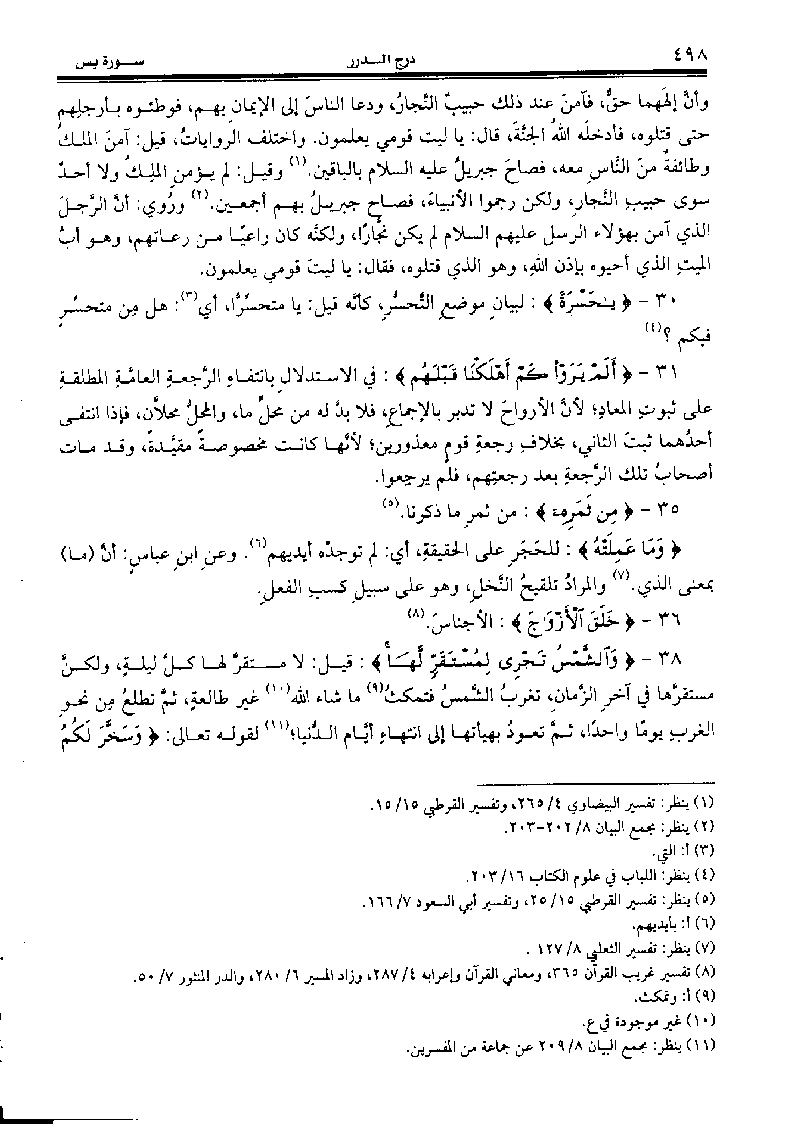 38 - {وَالشَّمْسُ تَجْرِي لِمُسْتَقَرٍّ لَها:} قيل: لا مستقرّ لها كلّ ليلة، ولكنّ مستقرّها في آخر الزّمان، تغرب الشّمس فتمكث (¬9) ما شاء الله (¬10) غير طالعة، ثمّ تطلع من نحو الغرب يوما واحدا، ثمّ تعود بهيأتها إلى انتهاء أيّام الدّنيا؛ (¬11) لقوله تعالى: {وَسَخَّرَ لَكُمُ}