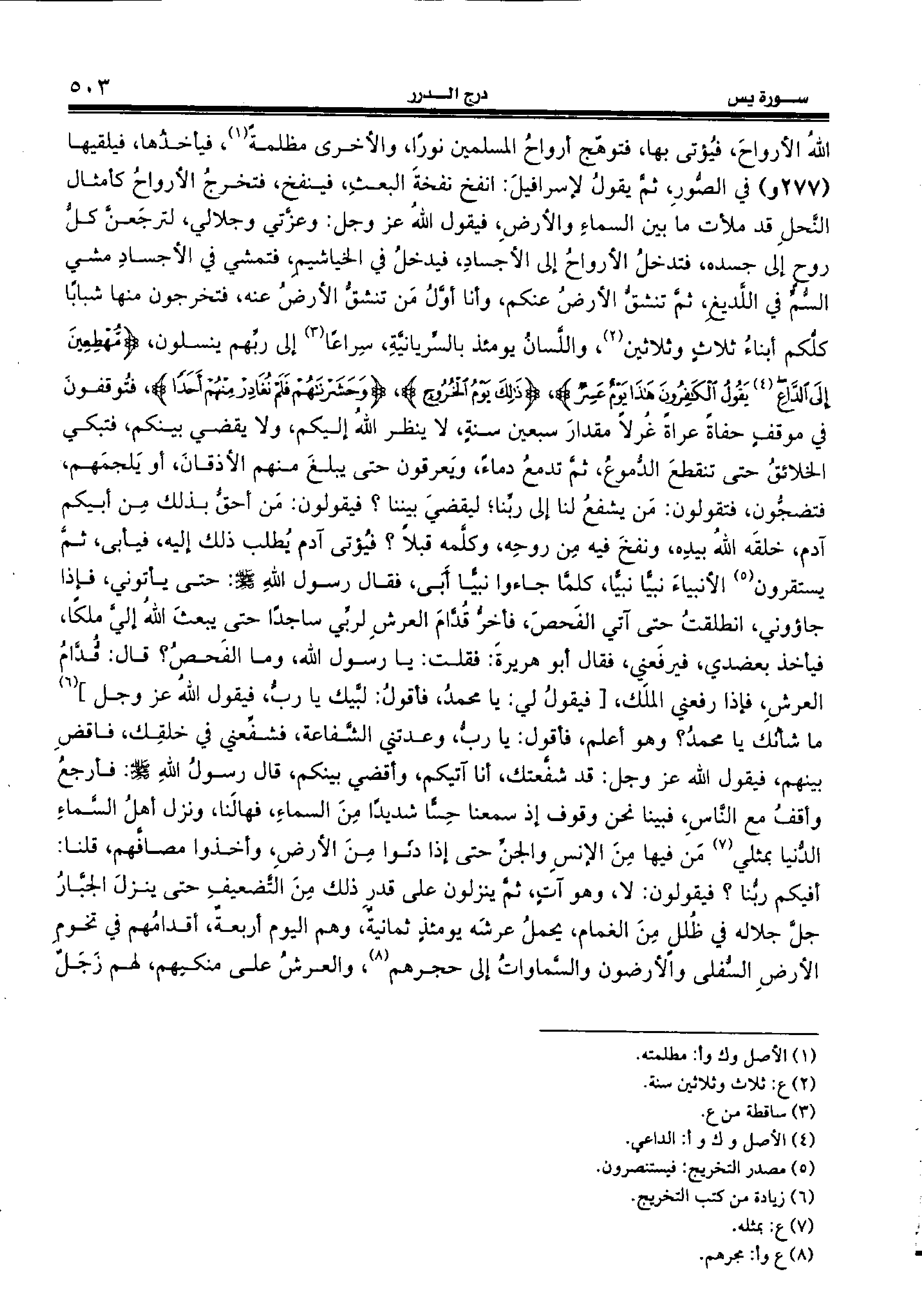 الله الأرواح، فيؤتى بها، فتوهّج أرواح المسلمين نورا، والأخرى مظلمة (¬1)، فيأخذها، فيلقيها (277 و) في الصّور، ثمّ يقول لإسرافيل: انفخ نفخة البعث، فينفخ، فتخرج الأرواح كأمثال النّحل قد ملأت ما بين السماء والأرض، فيقول الله عز وجل: وعزّتي وجلالي، لترجعنّ كلّ روح إلى جسده، فتدخل الأرواح إلى الأجساد، فيدخل في الخياشيم، فتمشي في الأجساد مشي السّمّ في اللّديغ، ثمّ تنشقّ الأرض عنكم، وأنا أوّل من تنشقّ الأرض عنه، فتخرجون منها شبابا كلّكم أبناء ثلاث وثلاثين (¬2)، واللّسان يومئذ بالسّريانيّة، سراعا (¬3) إلى ربّهم ينسلون، {مُهْطِعِينَ إِلَى الدّاعِ (¬4)} يَقُولُ الْكافِرُونَ هذا يَوْمٌ عَسِرٌ، {ذلِكَ يَوْمُ الْخُرُوجِ،} {وَحَشَرْناهُمْ فَلَمْ نُغادِرْ مِنْهُمْ أَحَداً} فتوقفون في موقف حفاة عراة غرلا مقدار سبعين سنة، لا ينظر الله إليكم، ولا يقضي بينكم، فتبكي الخلائق حتى تنقطع الدّموع، ثمّ تدمع دماء، ويعرقون حتى يبلغ منهم الأذقان، أو يلجمهم، فتضجّون، فتقولون: من يشفع لنا إلى ربّنا؛ ليقضي بيننا؟ فيقولون: من أحقّ بذلك من أبيكم آدم، خلقه الله بيده، ونفخ فيه من روحه، وكلّمه قبلا؟ فيؤتى آدم يطلب ذلك إليه، فيأبى، ثمّ يستقرون (¬5) الأنبياء نبيّا نبيّا، كلمّا جاءوا نبيّا أبى، فقال رسول الله صلّى الله عليه وسلّم: حتى يأتوني، فإذا جاؤوني، انطلقت حتى آتي الفحص، فأخرّ قدّام العرش لربّي ساجدا حتى يبعث الله إليّ ملكا، فيأخذ بعضدي، فيرفعني، فقال أبو هريرة: فقلت: يا رسول الله، وما الفحص؟ قال: قدّام العرش، فإذا رفعني الملك، [فيقول لي: يا محمد، فأقول: لبّيك يا ربّ، فيقول الله عز وجل] (¬6) ما شأنك يا محمد؟ وهو أعلم، فأقول: يا ربّ، وعدتني الشّفاعة، فشفّعني في خلقك، فاقض بينهم، فيقول الله عز وجل: قد شفّعتك، أنا آتيكم، وأقضي بينكم، قال رسول الله صلّى الله عليه وسلّم: فأرجع وأقف مع النّاس، فبينا نحن وقوف إذ سمعنا حسّا شديدا من السماء، فهالنا، ونزل أهل السّماء الدّنيا بمثلي (¬7) من فيها من الإنس والجنّ حتى إذا دنوا من الأرض، وأخذوا مصافّهم، قلنا: