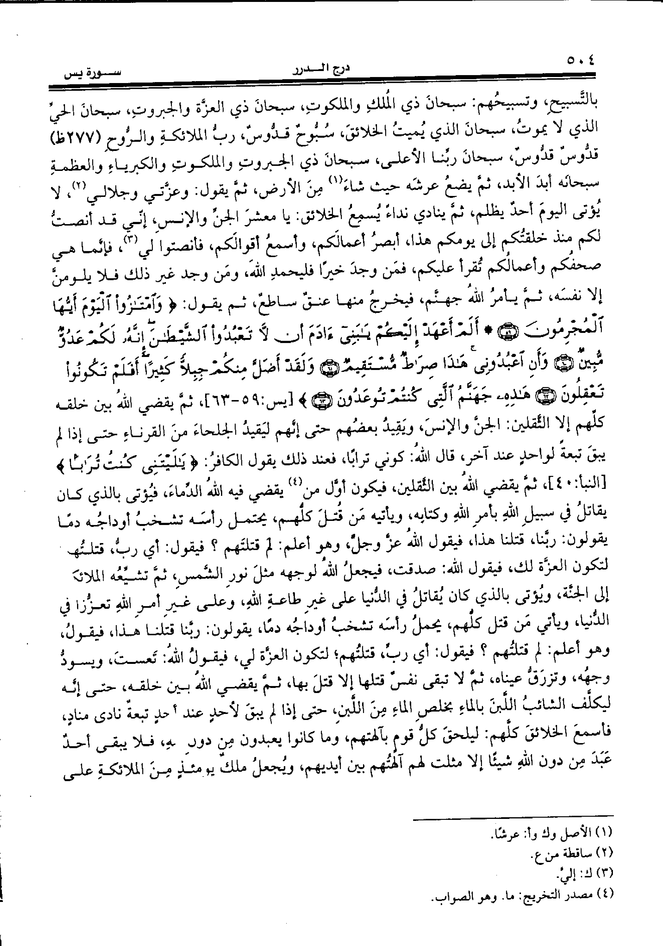 بالتّسبيح، وتسبيحهم: سبحان ذي الملك والملكوت، سبحان ذي العزّة والجبروت، سبحان الحيّ الذي لا يموت، سبحان الذي يميت الخلائق، سبّوح قدّوس، ربّ الملائكة والرّوح (277 ظ) قدّوس قدّوس، سبحان ربّنا الأعلى، سبحان ذي الجبروت والملكوت والكبرياء والعظمة سبحانه أبد الأبد، ثمّ يضع عرشه حيث شاء (¬1) من الأرض، ثمّ يقول: وعزّتي وجلالي (¬2)، لا يؤتى اليوم أحد يظلم، ثمّ ينادي نداء يسمع الخلائق: يا معشر الجنّ والإنس، إنّي قد أنصتّ لكم منذ خلقتكم إلى يومكم هذا، أبصر أعمالكم، وأسمع أقوالكم، فأنصتوا لي (¬3)، فإنّما هي صحفكم وأعمالكم تقرأ عليكم، فمن وجد خيرا فليحمد الله، ومن وجد غير ذلك فلا يلومنّ إلا نفسه، ثمّ يأمر الله جهنّم، فيخرج منها عنق ساطع، ثم يقول: {وَاِمْتازُوا الْيَوْمَ أَيُّهَا الْمُجْرِمُونَ (59) *أَلَمْ أَعْهَدْ إِلَيْكُمْ يا بَنِي آدَمَ أَنْ لا تَعْبُدُوا الشَّيْطانَ إِنَّهُ لَكُمْ عَدُوٌّ مُبِينٌ (60) وَأَنِ اُعْبُدُونِي هذا صِراطٌ مُسْتَقِيمٌ (61) وَلَقَدْ أَضَلَّ مِنْكُمْ جِبِلاًّ كَثِيراً أَفَلَمْ تَكُونُوا تَعْقِلُونَ (62) هذِهِ جَهَنَّمُ الَّتِي كُنْتُمْ تُوعَدُونَ} (63) [يس:59 - 63]، ثمّ يقضي الله بين خلقه كلّهم إلا الثّقلين: الجنّ والإنس، ويقيد بعضهم حتى إنّهم ليقيد الجلحاء من القرناء حتى إذا لم يبق تبعة لواحد عند آخر، قال الله: كوني ترابا، فعند ذلك يقول الكافر: {يا لَيْتَنِي كُنْتُ تُراباً} [النبأ:40]، ثمّ يقضي الله بين الثّقلين، فيكون أوّل من (¬4) يقضي فيه الله الدّماء، فيؤتى بالذي كان يقاتل في سبيل الله بأمر الله وكتابه، ويأتيه من قتل كلّهم، يحتمل رأسه تشخب أوداجه دما يقولون: ربّنا، قتلنا هذا، فيقول الله عزّ وجلّ، وهو أعلم: لم قتلتهم؟ فيقول: أي ربّ، قتلتهم لتكون العزّة لك، فيقول الله: صدقت، فيجعل الله لوجهه مثل نور الشّمس، ثمّ تشيّعه الملائكة إلى الجنّة، ويؤتى بالذي كان يقاتل في الدّنيا على غير طاعة الله، وعلى غير أمر الله تعزّزا في الدّنيا، ويأتي من قتل كلّهم، يحمل رأسه تشخب أوداجه دما، يقولون: ربّنا قتلنا هذا، فيقول، وهو أعلم: لم قتلتهم؟ فيقول: أي ربّ، قتلتهم؛ لتكون العزّة لي، فيقول الله: تعست، ويسودّ وجهه، وتزرقّ عيناه، ثمّ لا تبقى نفس قتلها إلا قتل بها، ثمّ يقضي الله بين خلقه، حتى إنّه ليكلّف الشائب اللّبن بالماء بخلص الماء من اللّبن، حتى إذا لم يبق لأحد عند أحد تبعة نادى مناد، فأسمع الخلائق كلّهم: ليلحق كلّ قوم بآلهتهم، وما كانوا يعبدون من دون الله، فلا يبقى أحد عبد من دون الله شيئا إلا مثلت لهم آلهتهم بين أيديهم، ويجعل ملك يومئذ من الملائكة على