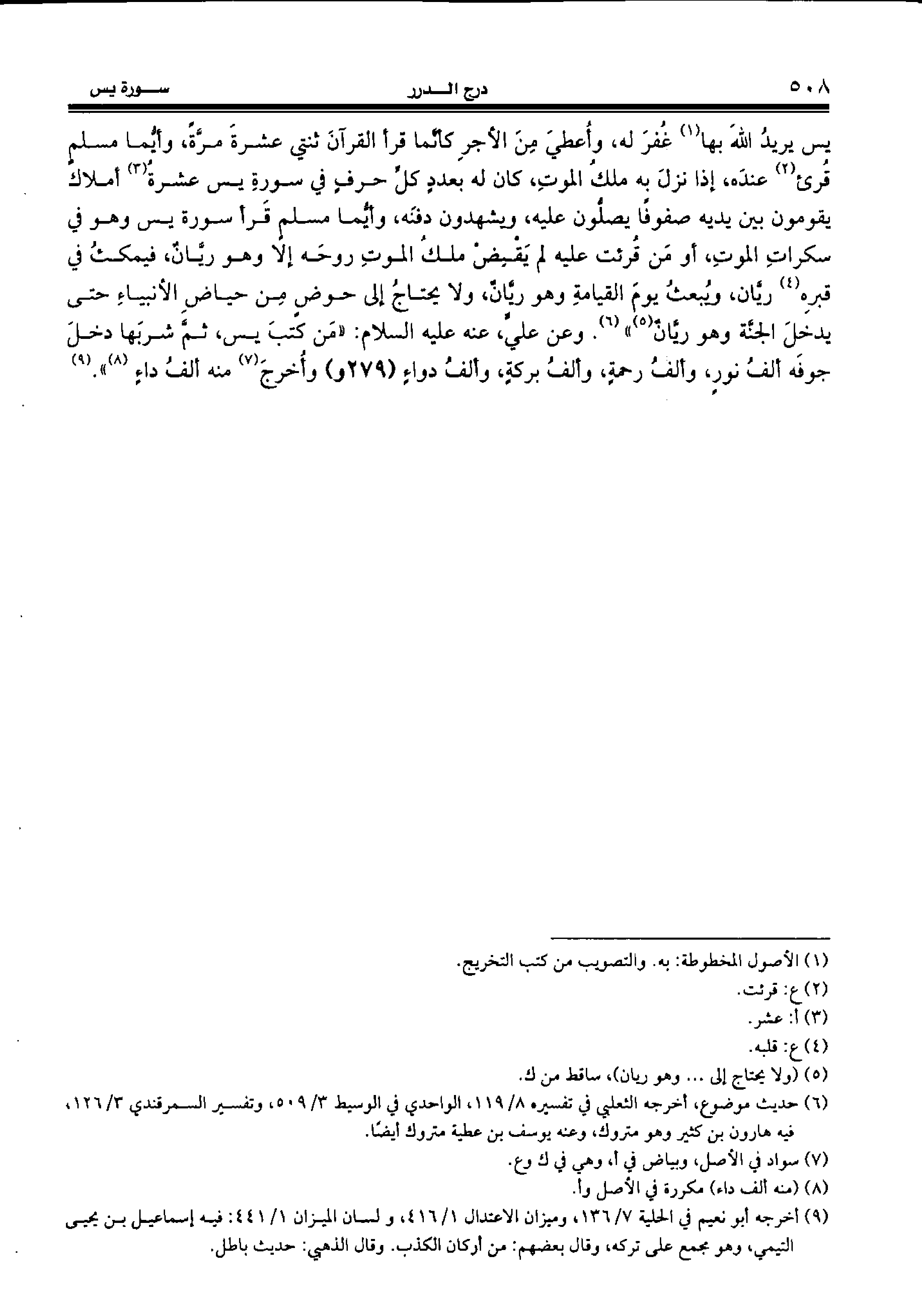 يس يريد الله بها (¬1) غفر له، وأعطي من الأجر كأنّما قرأ القرآن ثنتي عشرة مرّة، وأيّما مسلم قرئ (¬2) عنده، إذا نزل به ملك الموت، كان له بعدد كلّ حرف في سورة يس عشرة (¬3) أملاك يقومون بين يديه صفوفا يصلّون عليه، ويشهدون دفنه، وأيّما مسلم قرأ سورة يس وهو في سكرات الموت، أو من قرئت عليه لم يقبض ملك الموت روحه إلا وهو ريّان، فيمكث في قبره (¬4) ريّان، ويبعث يوم القيامة وهو ريّان، ولا يحتاج إلى حوض من حياض الأنبياء حتى يدخل الجنّة وهو ريّان (¬5)» (¬6). وعن عليّ، عنه عليه السّلام: «من كتب يس، ثمّ شربها دخل جوفه ألف نور، وألف رحمة، وألف بركة، وألف دواء (279 و) وأخرج (¬7) منه ألف داء (¬8)». (¬9)