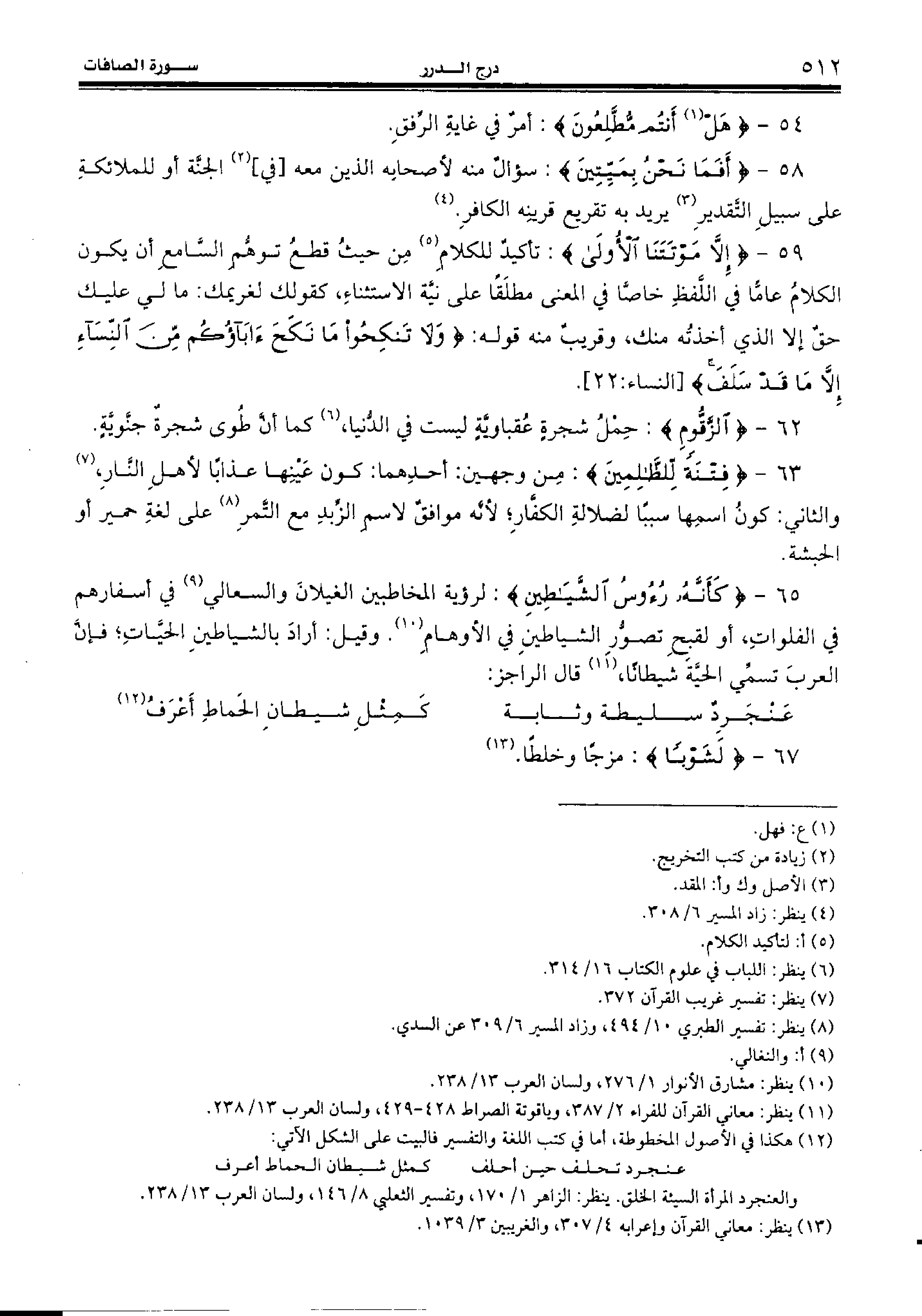 65 - {كَأَنَّهُ رُؤُسُ الشَّياطِينِ:} لرؤية المخاطبين الغيلان والسعالي (¬9) في أسفارهم في الفلوات، أو لقبح تصوّر الشياطين في الأوهام (¬10). وقيل: أراد بالشياطين الحيّات؛ فإنّ العرب تسمّي الحيّة شيطانا، (¬11) قال الراجز: