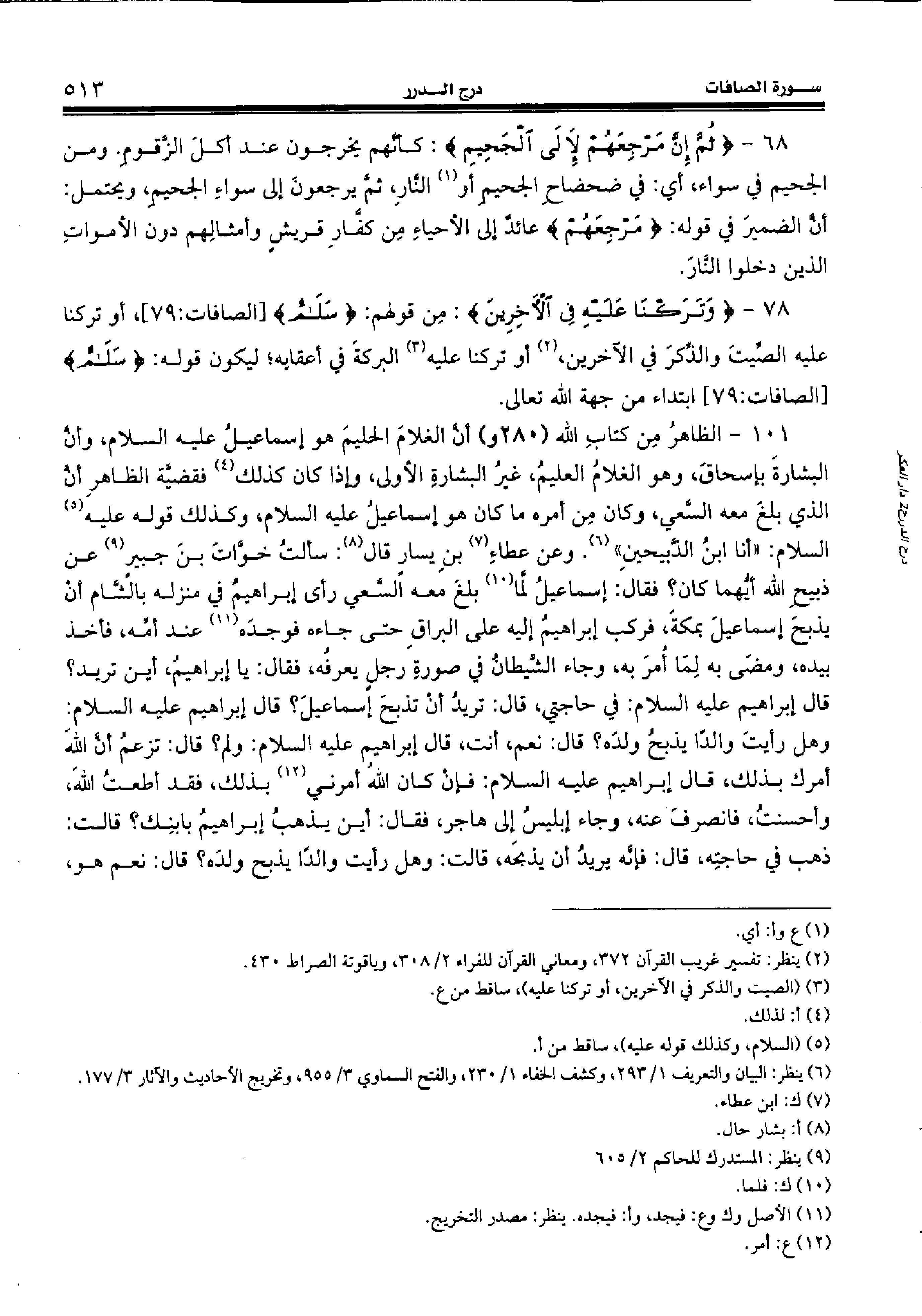 101 - الظاهر من كتاب الله (280 و) أنّ الغلام الحليم هو إسماعيل عليه السّلام، وأنّ البشارة بإسحاق، وهو الغلام العليم، غير البشارة الأولى، وإذا كان كذلك (¬4) فقضيّة الظاهر أنّ الذي بلغ معه السّعي، وكان من أمره ما كان هو إسماعيل عليه السّلام، وكذلك قوله عليه (¬5) السّلام: «أنا ابن الذّبيحين» (¬6). وعن عطاء (¬7) بن يسار قال (¬8): سألت خوّات بن جبير (¬9) عن ذبيح الله أيّهما كان؟ فقال: إسماعيل لّما (¬10) بلغ معه السّعي رأى إبراهيم في منزله بالشّام أن يذبح إسماعيل بمكة، فركب إبراهيم إليه على البراق حتى جاءه فوجده (¬11) عند أمّه، فأخذ بيده، ومضى به لما أمر به، وجاء الشّيطان في صورة رجل يعرفه، فقال: يا إبراهيم، أين تريد؟ قال إبراهيم عليه السّلام: في حاجتي، قال: تريد أن تذبح إسماعيل؟ قال إبراهيم عليه السّلام: