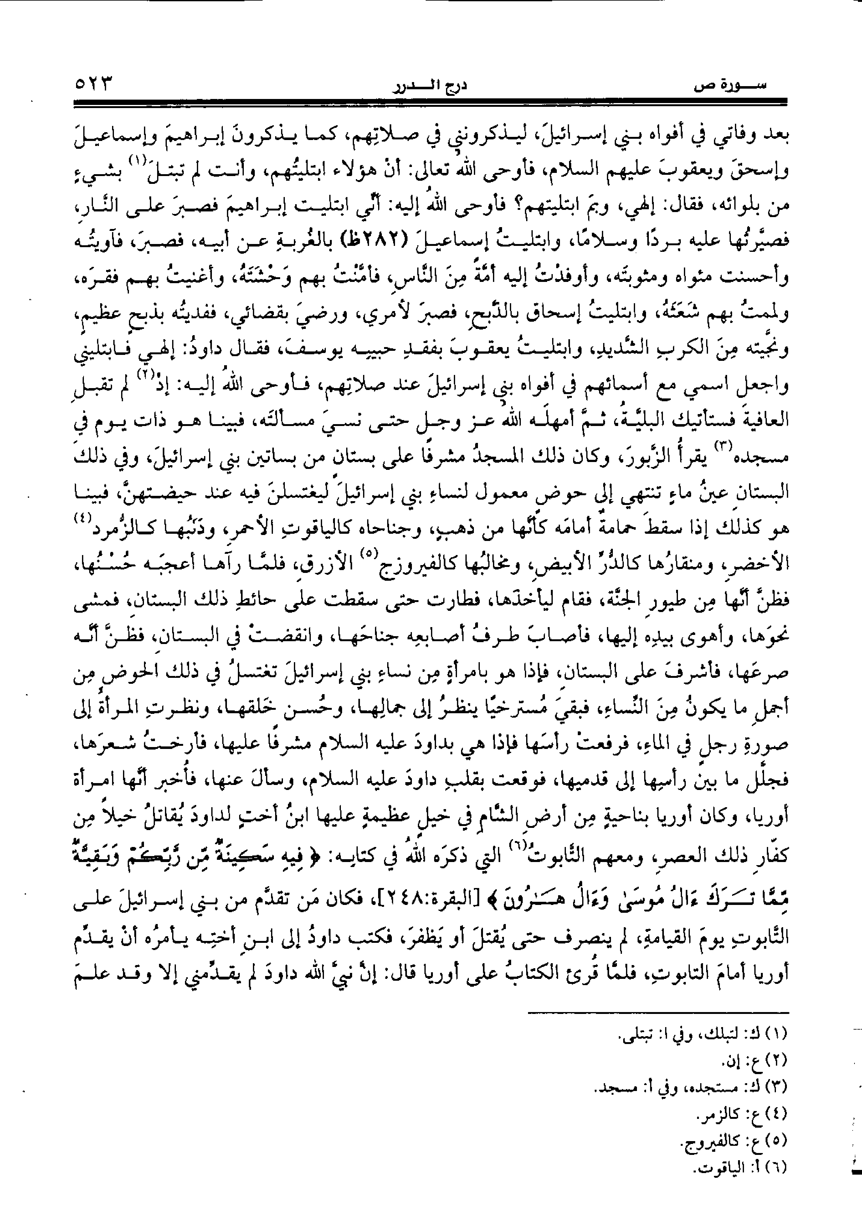 بعد وفاتي في أفواه بني إسرائيل، ليذكرونني في صلاتهم، كما يذكرون إبراهيم وإسماعيل وإسحق ويعقوب عليهم السّلام، فأوحى الله تعالى: أن هؤلاء ابتليتهم، وأنت لم تبتل (¬1) بشيء من بلوائه، فقال: إلهي، وبم ابتليتهم؟ فأوحى الله إليه: أنّي ابتليت إبراهيم فصبر على النّار، فصيّرتها عليه بردا وسلاما، وابتليت إسماعيل (282 ظ) بالغربة عن أبيه، فصبر، فآويته وأحسنت مثواه ومثوبته، وأوفدت إليه أمّة من النّاس، فأمّنت بهم وحشته، وأغنيت بهم فقره، ولممت بهم شعثه، وابتليت إسحاق بالذّبح، فصبر لأمري، ورضي بقضائي، ففديته بذبح عظيم، ونجّيته من الكرب الشّديد، وابتليت يعقوب بفقد حبيبه يوسف، فقال داود: إلهي فابتليني واجعل اسمي مع أسمائهم في أفواه بني إسرائيل عند صلاتهم، فأوحى الله إليه: إذ (¬2) لم تقبل العافية فستأتيك البليّة، ثمّ أمهله الله عز وجل حتى نسي مسألته، فبينا هو ذات يوم في مسجده (¬3) يقرأ الزّبور، وكان ذلك المسجد مشرفا على بستان من بساتين بني إسرائيل، وفي ذلك البستان عين ماء تنتهي إلى حوض معمول لنساء بني إسرائيل ليغتسلن فيه عند حيضتهنّ، فبينا هو كذلك إذا سقط حمامة أمامه كأنّها من ذهب، وجناحاه كالياقوت الأحمر، وذنبها كالزّمرد (¬4) الأخضر، ومنقارها كالدّرّ الأبيض، ومخالبها كالفيروزج (¬5) الأزرق، فلمّا رآها أعجبه حسنها، فظنّ أنّها من طيور الجنّة، فقام ليأخذها، فطارت حتى سقطت على حائط ذلك البستان، فمشى نحوها، وأهوى بيده إليها، فأصاب طرف أصابعه جناحها، وانقضت في البستان، فظنّ أنّه صرعها، فأشرف على البستان، فإذا هو بامرأة من نساء بني إسرائيل تغتسل في ذلك الحوض من أجمل ما يكون من النّساء، فبقي مسترخيا ينظر إلى جمالها، وحسن خلقها، ونظرت المرأة إلى صورة رجل في الماء، فرفعت رأسها فإذا هي بداود عليه السّلام مشرفا عليها، فأرخت شعرها، فجلّل ما بين رأسها إلى قدميها، فوقعت بقلب داود عليه السّلام، وسأل عنها، فأخبر أنّها امرأة أوريا، وكان أوريا بناحية من أرض الشّام في خيل عظيمة عليها ابن أخت لداود يقاتل خيلا من كفّار ذلك العصر، ومعهم التّابوت (¬6) التي ذكره الله في كتابه: {فِيهِ سَكِينَةٌ مِنْ رَبِّكُمْ وَبَقِيَّةٌ مِمّا تَرَكَ آلُ مُوسى وَآلُ هارُونَ} [البقرة:248]، فكان من تقدّم من بني إسرائيل على التّابوت يوم القيامة، لم ينصرف حتى يقتل أو يظفر، فكتب داود إلى ابن أخته يأمره أن يقدّم أوريا أمام التابوت، فلمّا قرئ الكتاب على أوريا قال: إنّ نبيّ الله داود لم يقدّمني إلا وقد علم