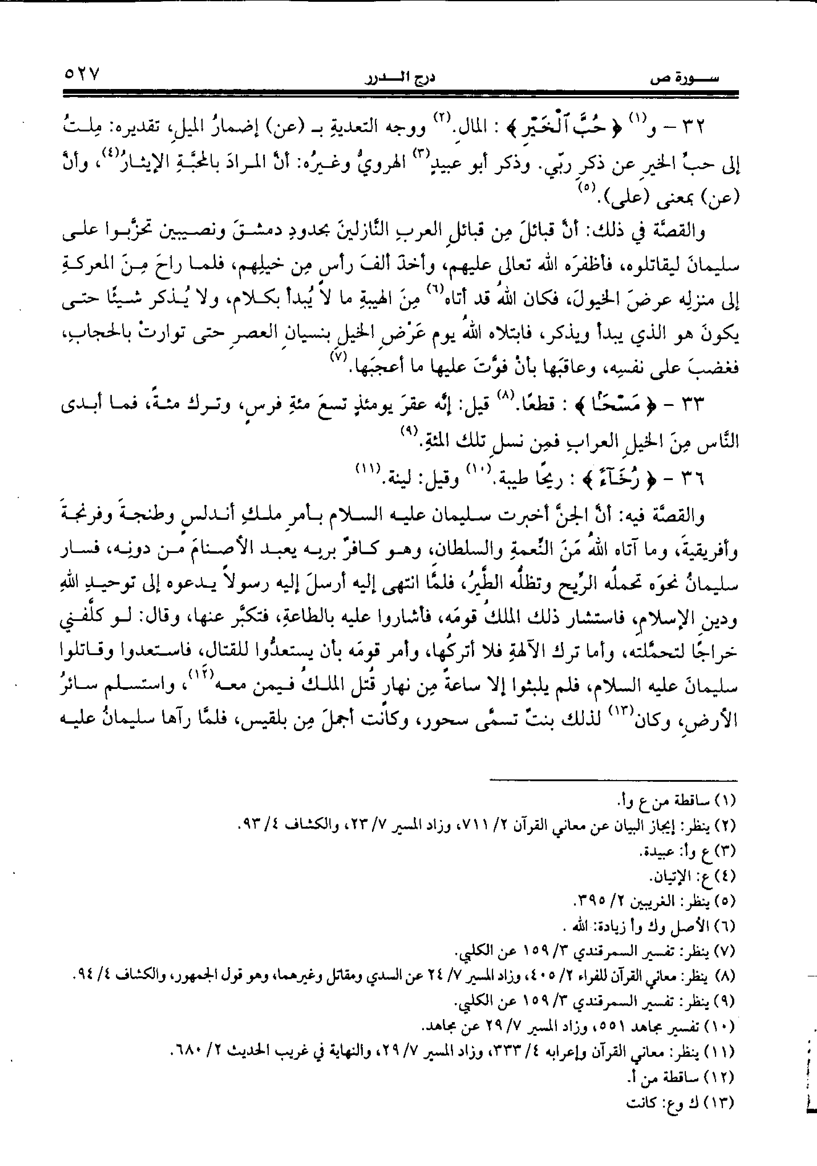 32 - و (¬1) {حُبَّ الْخَيْرِ:} المال. (¬2) ووجه التعدية ب (عن) إضمار الميل، تقديره: ملت إلى حبّ الخير عن ذكر ربّي. وذكر أبو عبيد (¬3) الهرويّ وغيره: أنّ المراد بالمحبّة الإيثار (¬4)، وأنّ (عن) بمعنى (على). (¬5)