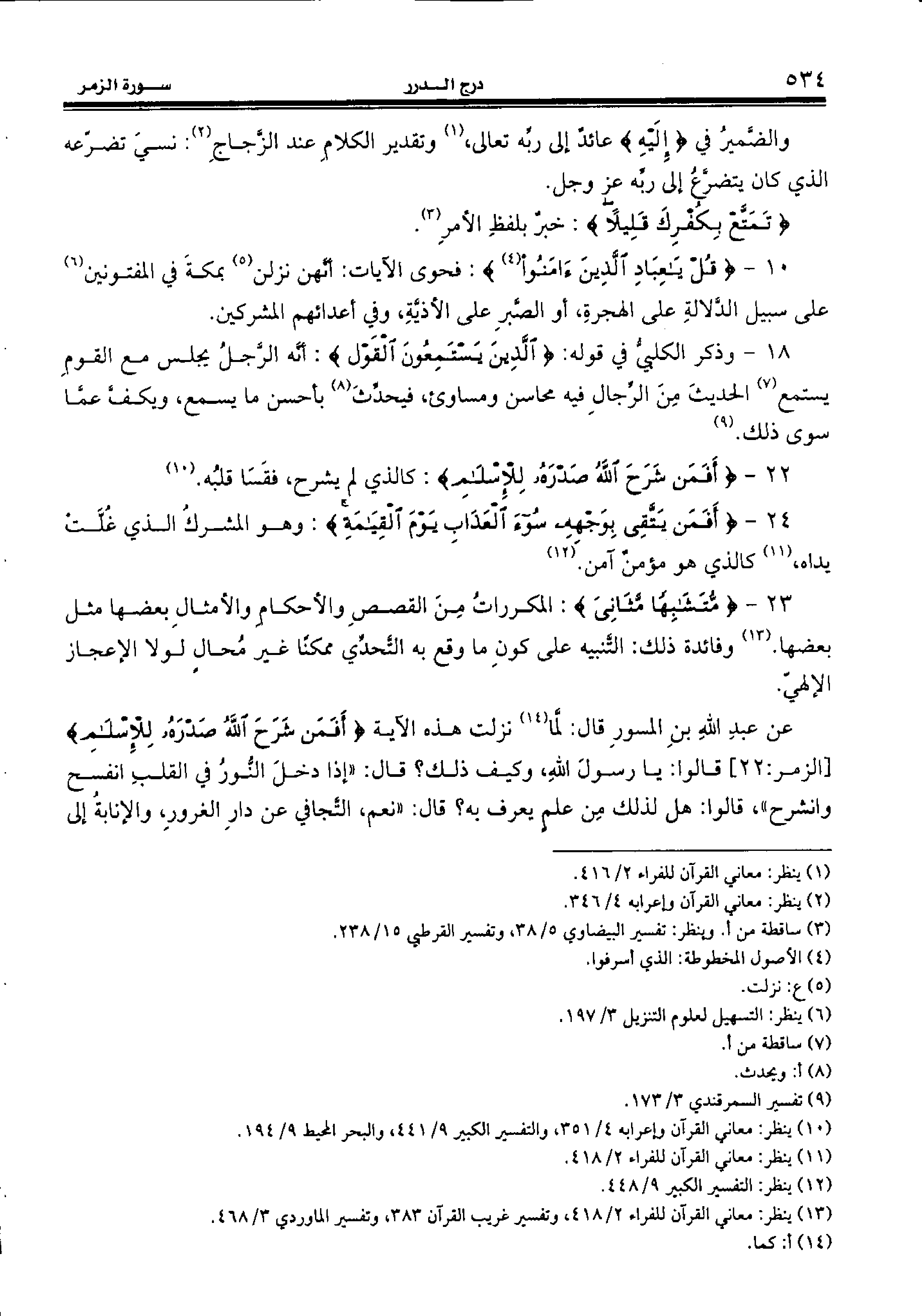23 - {مُتَشابِهاً مَثانِيَ:} المكررات من القصص والأحكام والأمثال بعضها مثل بعضها. (¬13) وفائدة ذلك: التّنبيه على كون ما وقع به التّحدّي ممكنا غير محال لولا الإعجاز الإلهيّ.
