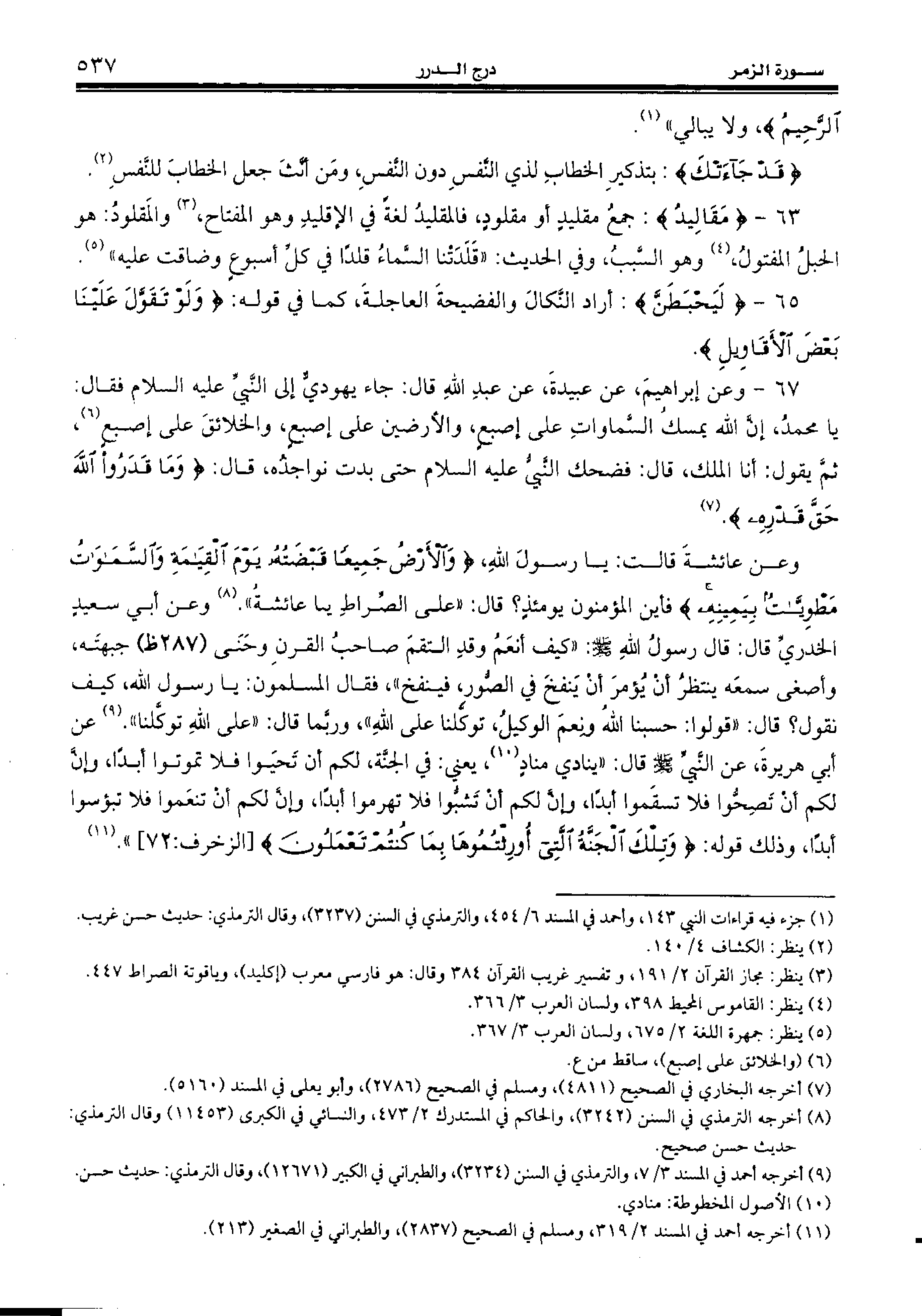 63 - {مَقالِيدُ:} جمع مقليد أو مقلود، فالمقليد لغة في الإقليد وهو المفتاح، (¬3) والمقلود: هو الحبل المفتول، (¬4) وهو السّبب، وفي الحديث: «قلدتنا السّماء قلدا في كلّ أسبوع وضاقت عليه» (¬5).