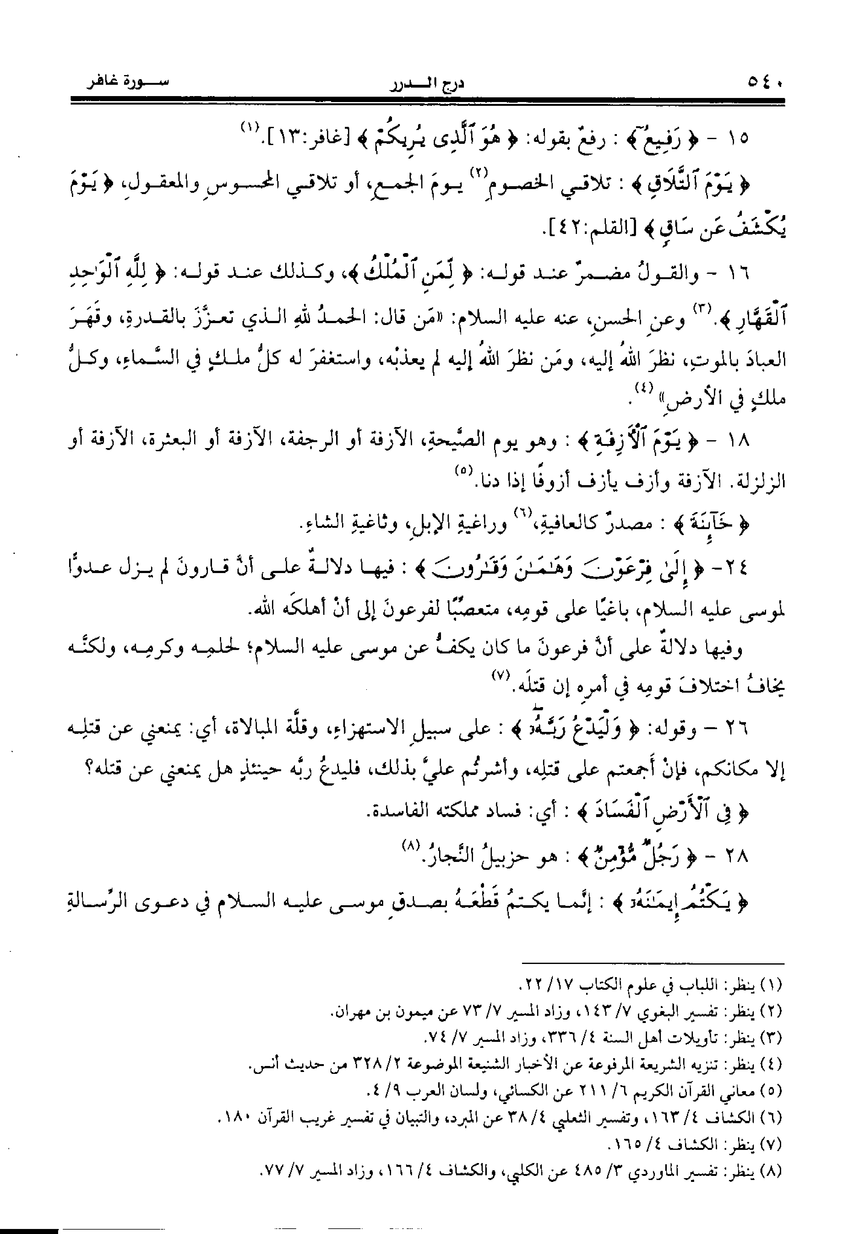 16 - والقول مضمر عند قوله: {لِمَنِ الْمُلْكُ،} وكذلك عند قوله: {لِلّهِ الْواحِدِ الْقَهّارِ.} (¬3) وعن الحسن، عنه عليه السّلام: «من قال: الحمد لله الذي تعزّز بالقدرة، وقهر العباد بالموت، نظر الله إليه، ومن نظر الله إليه لم يعذبه، واستغفر له كلّ ملك في السّماء، وكلّ ملك في الأرض» (¬4).