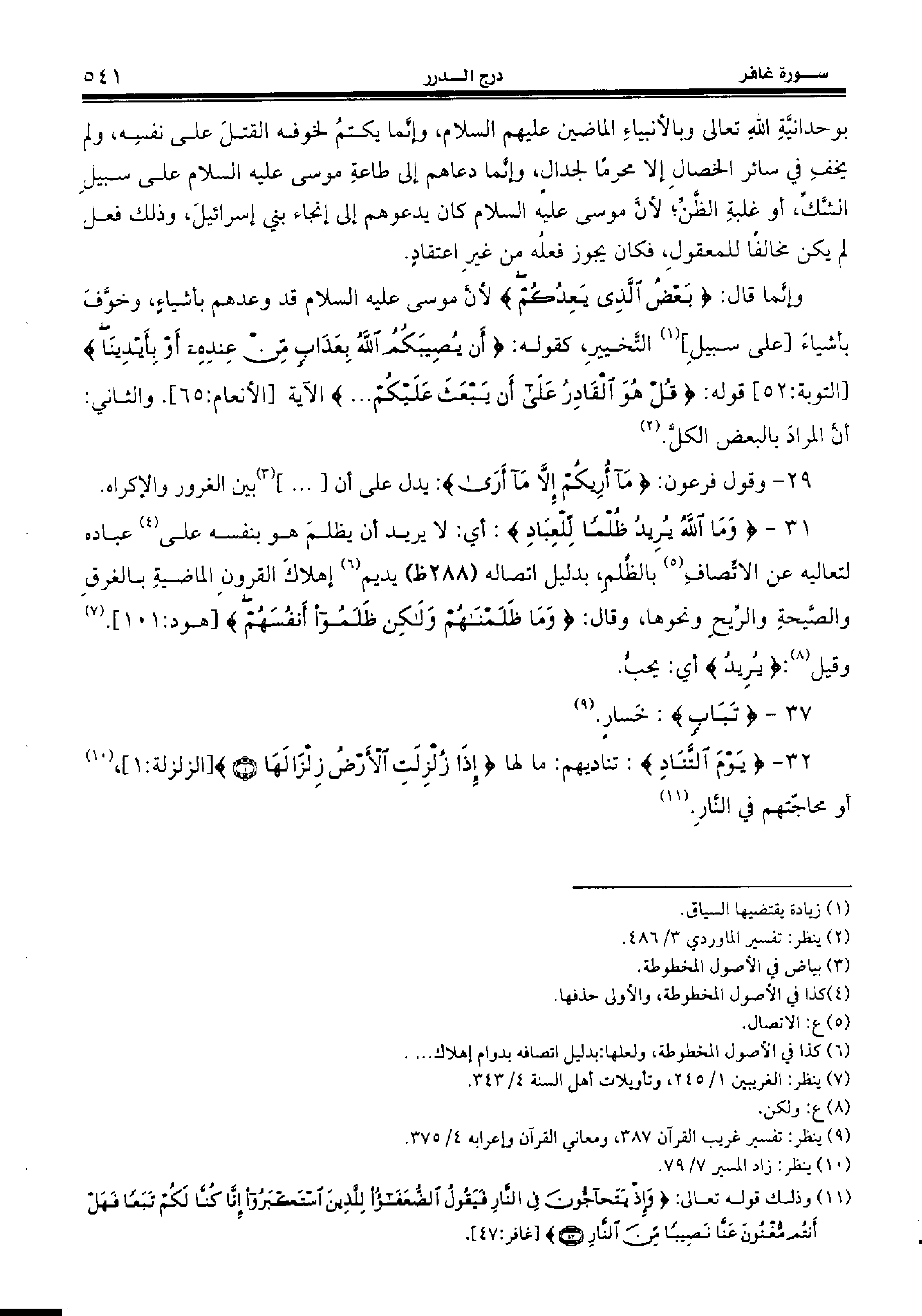 32 - {يَوْمَ التَّنادِ:} تناديهم: ما لها {إِذا زُلْزِلَتِ الْأَرْضُ زِلْزالَها} (1) [الزلزلة:1]، (¬10) أو محاجّتهم في النّار. (¬11)