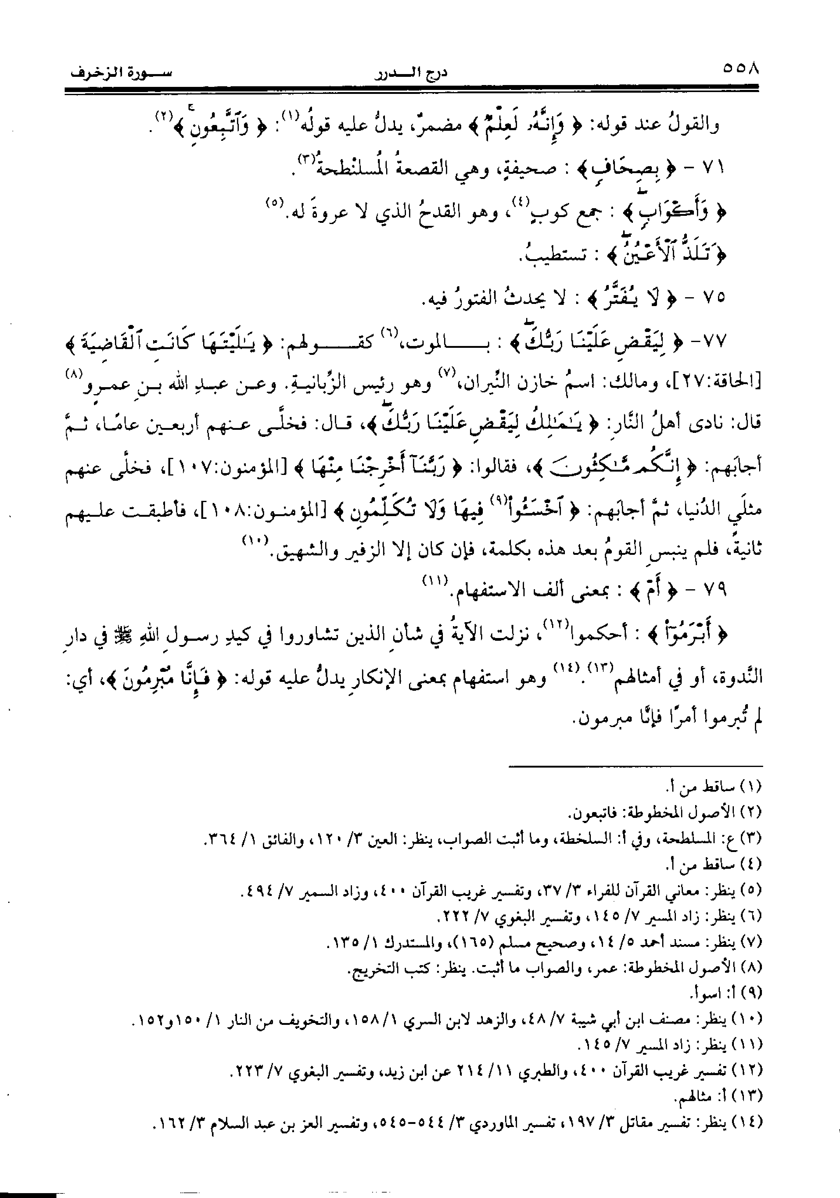 77 - {لِيَقْضِ عَلَيْنا رَبُّكَ:} بالموت، (¬6) كقولهم: {يا لَيْتَها كانَتِ الْقاضِيَةَ} [الحاقة:27]، ومالك: اسم خازن النّيران، (¬7) وهو رئيس الزّبانية. وعن عبد الله بن عمرو (¬8) قال: نادى أهل النّار: {يا مالِكُ لِيَقْضِ عَلَيْنا رَبُّكَ} قال: فخلّى عنهم أربعين عاما، ثمّ أجابهم: {إِنَّكُمْ ماكِثُونَ} فقالوا: {رَبَّنا أَخْرِجْنا مِنْها} [المؤمنون:107]، فخلّى عنهم مثلي الدنيا، ثمّ أجابهم: {اِخْسَؤُا (¬9)} فِيها وَلا تُكَلِّمُونِ [المؤمنون:108]، فأطبقت عليهم ثانية، فلم ينبس القوم بعد هذه بكلمة، فإن كان إلا الزفير والشهيق. (¬10)