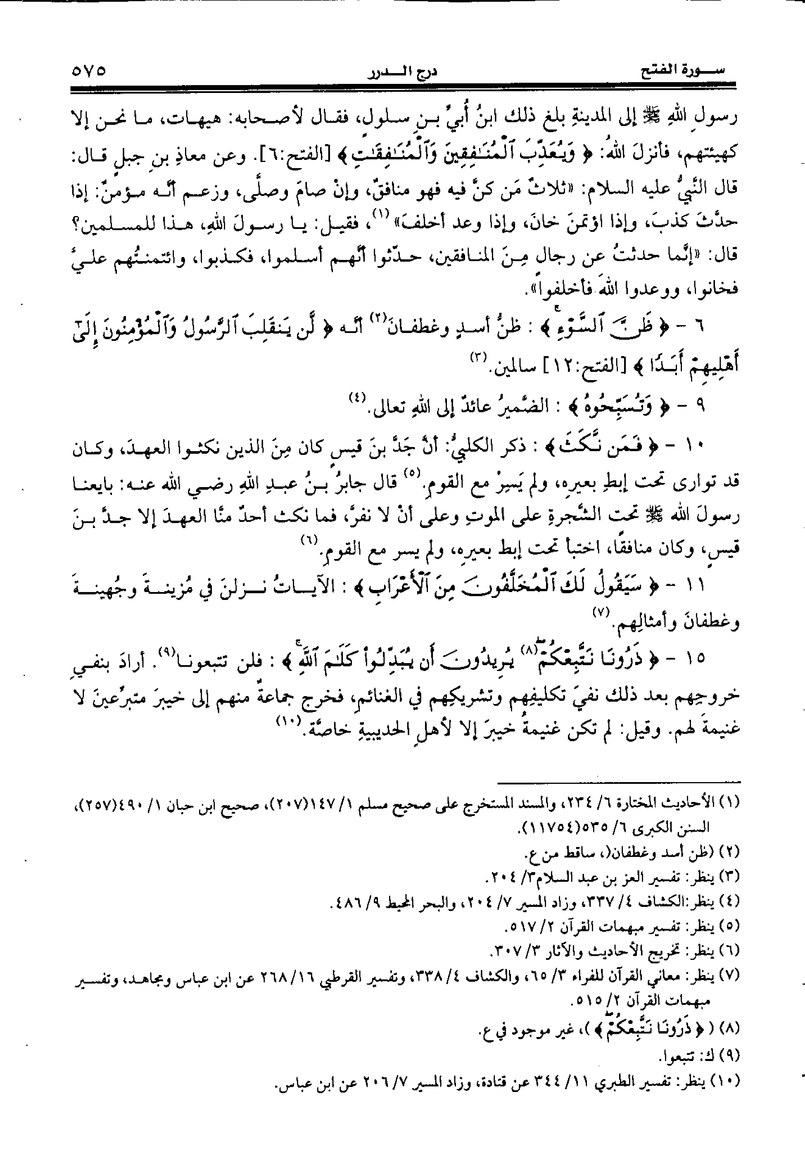 15 - {ذَرُونا نَتَّبِعْكُمْ (¬8)} يُرِيدُونَ أَنْ يُبَدِّلُوا كَلامَ اللهِ: فلن تتبعونا (¬9). أراد بنفي خروجهم بعد ذلك نفي تكليفهم وتشريكهم في الغنائم، فخرج جماعة منهم إلى خيبر متبرّعين لا غنيمة لهم. وقيل: لم تكن غنيمة خيبر إلا لأهل الحديبية خاصّة. (¬10)