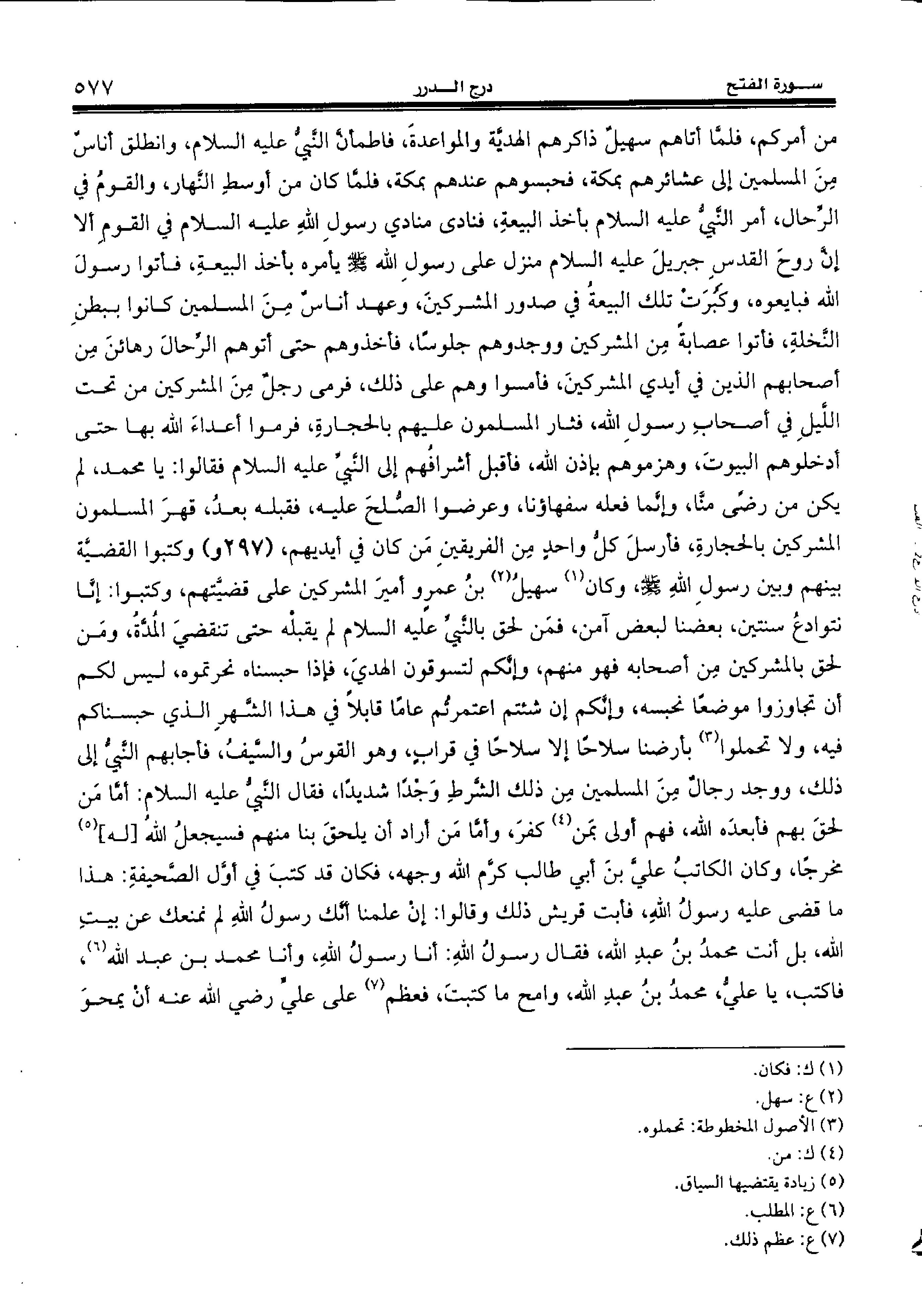 من أمركم، فلمّا أتاهم سهيل ذاكرهم الهديّة والمواعدة، فاطمأنّ النّبيّ عليه السّلام، وانطلق أناس من المسلمين إلى عشائرهم بمكة، فحبسوهم عندهم بمكة، فلمّا كان من أوسط النّهار، والقوم في الرّحال، أمر النّبيّ عليه السّلام بأخذ البيعة، فنادى منادي رسول الله عليه السّلام في القوم ألا إنّ روح القدس جبريل عليه السّلام منزل على رسول الله صلّى الله عليه وسلّم يأمره بأخذ البيعة، فأتوا رسول الله فبايعوه، وكبرت تلك البيعة في صدور المشركين، وعهد أناس من المسلمين كانوا ببطن النّخلة، فأتوا عصابة من المشركين ووجدوهم جلوسا، فأخذوهم حتى أتوهم الرّحال رهائن من أصحابهم الذين في أيدي المشركين، فأمسوا وهم على ذلك، فرمى رجل من المشركين من تحت اللّيل في أصحاب رسول الله، فثار المسلمون عليهم بالحجارة، فرموا أعداء الله بها حتى أدخلوهم البيوت، وهزموهم بإذن الله، فأقبل أشرافهم إلى النّبيّ عليه السّلام فقالوا: يا محمد، لم يكن من رضى منّا، وإنّما فعله سفهاؤنا، وعرضوا الصّلح عليه، فقبله بعد، قهر المسلمون المشركين بالحجارة، فأرسل كلّ واحد من الفريقين من كان في أيديهم، (297 و) وكتبوا القضيّة بينهم وبين رسول الله صلّى الله عليه وسلّم، وكان (¬1) سهيل (¬2) بن عمرو أمير المشركين على قضيّتهم، وكتبوا: إنّا نتوادع سنتين، بعضنا لبعض آمن، فمن لحق بالنّبيّ عليه السّلام لم يقبله حتى تنقضي المدّة، ومن لحق بالمشركين من أصحابه فهو منهم، وإنّكم لتسوقون الهدي، فإذا حبسناه نحرتموه، ليس لكم أن تجاوزوا موضعا نحبسه، وإنّكم إن شئتم اعتمرتم عاما قابلا في هذا الشّهر الذي حبسناكم فيه، ولا تحملوا (¬3) بأرضنا سلاحا إلا سلاحا في قراب، وهو القوس والسّيف، فأجابهم النّبيّ إلى ذلك، ووجد رجال من المسلمين من ذلك الشّرط وجدا شديدا، فقال النّبيّ عليه السّلام: أمّا من لحق بهم فأبعده الله، فهم أولى بمن (¬4) كفر، وأمّا من أراد أن يلحق بنا منهم فسيجعل الله [له] (¬5) مخرجا، وكان الكاتب عليّ بن أبي طالب كرّم الله وجهه، فكان قد كتب في أوّل الصّحيفة: هذا ما قضى عليه رسول الله، فأبت قريش ذلك وقالوا: إن علمنا أنّك رسول الله لم نمنعك عن بيت الله، بل أنت محمد بن عبد الله، فقال رسول الله: أنا رسول الله، وأنا محمد بن عبد الله (¬6)، فاكتب، يا عليّ، محمد بن عبد الله، وامح ما كتبت، فعظم (¬7) على عليّ رضي الله عنه أن يمحو