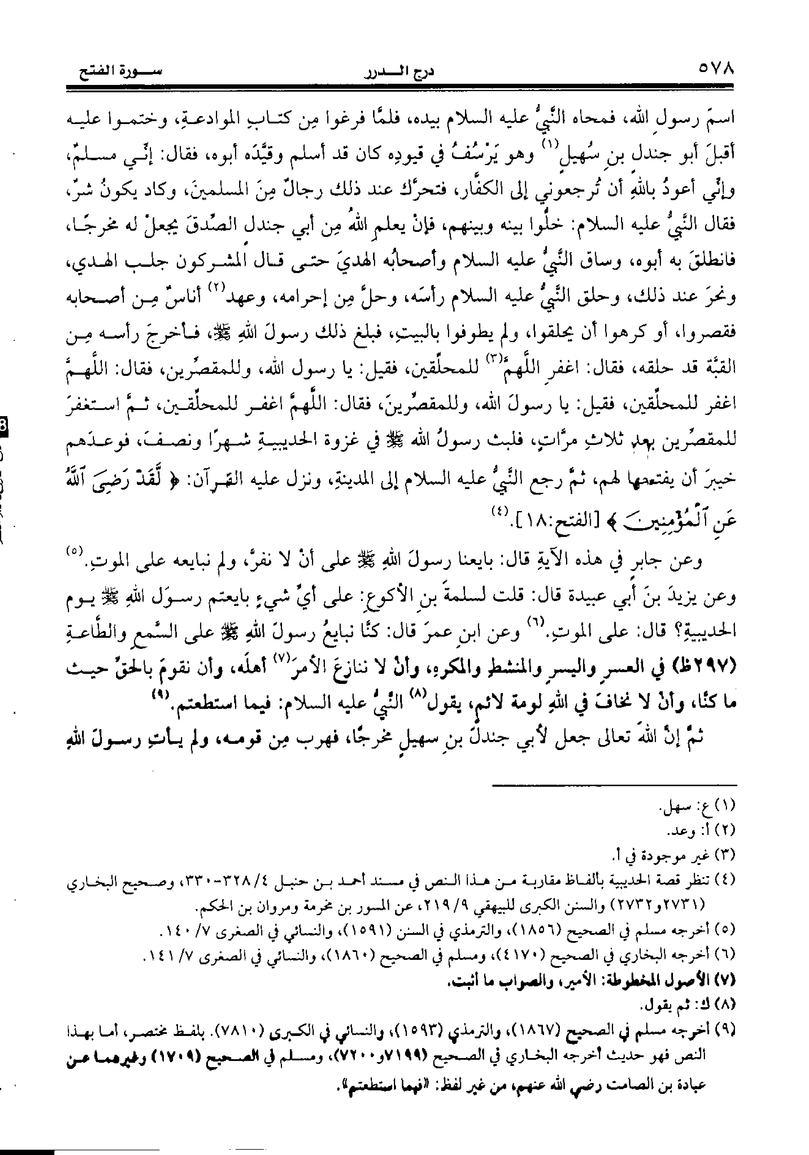 (¬4) تنظر قصة الحديبية بألفاظ مقاربة من هذا النص في مسند أحمد بن حنبل 4/ 328 - 330، وصحيح البخاري (2731 و 2732) والسنن الكبرى للبيهقي 9/ 219، عن المسور بن مخرمة ومروان بن الحكم.