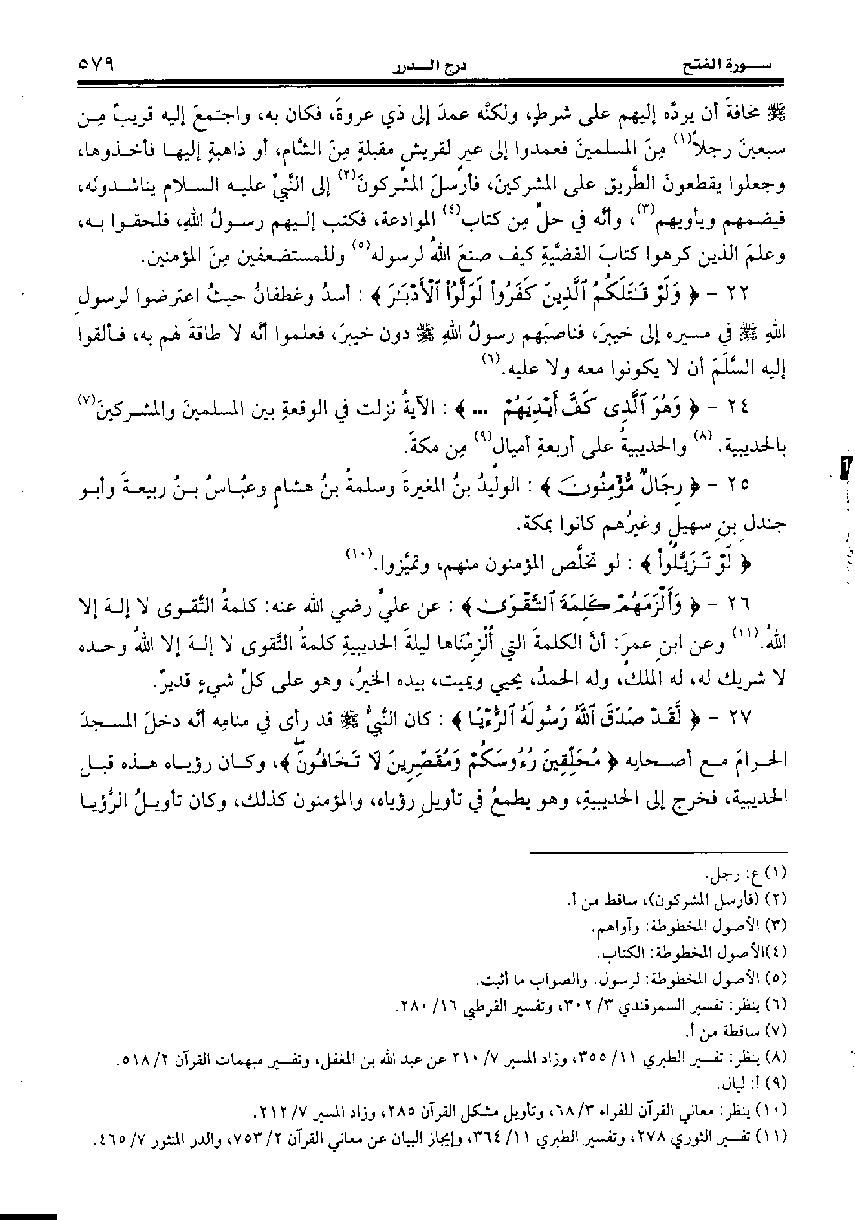22 - {وَلَوْ قاتَلَكُمُ الَّذِينَ كَفَرُوا لَوَلَّوُا الْأَدْبارَ:} أسد وغطفان حيث اعترضوا لرسول الله صلّى الله عليه وسلّم في مسيره إلى خيبر، فناصبهم رسول الله صلّى الله عليه وسلّم دون خيبر، فعلموا أنّه لا طاقة لهم به، فألقوا إليه السّلم أن لا يكونوا معه ولا عليه. (¬6)