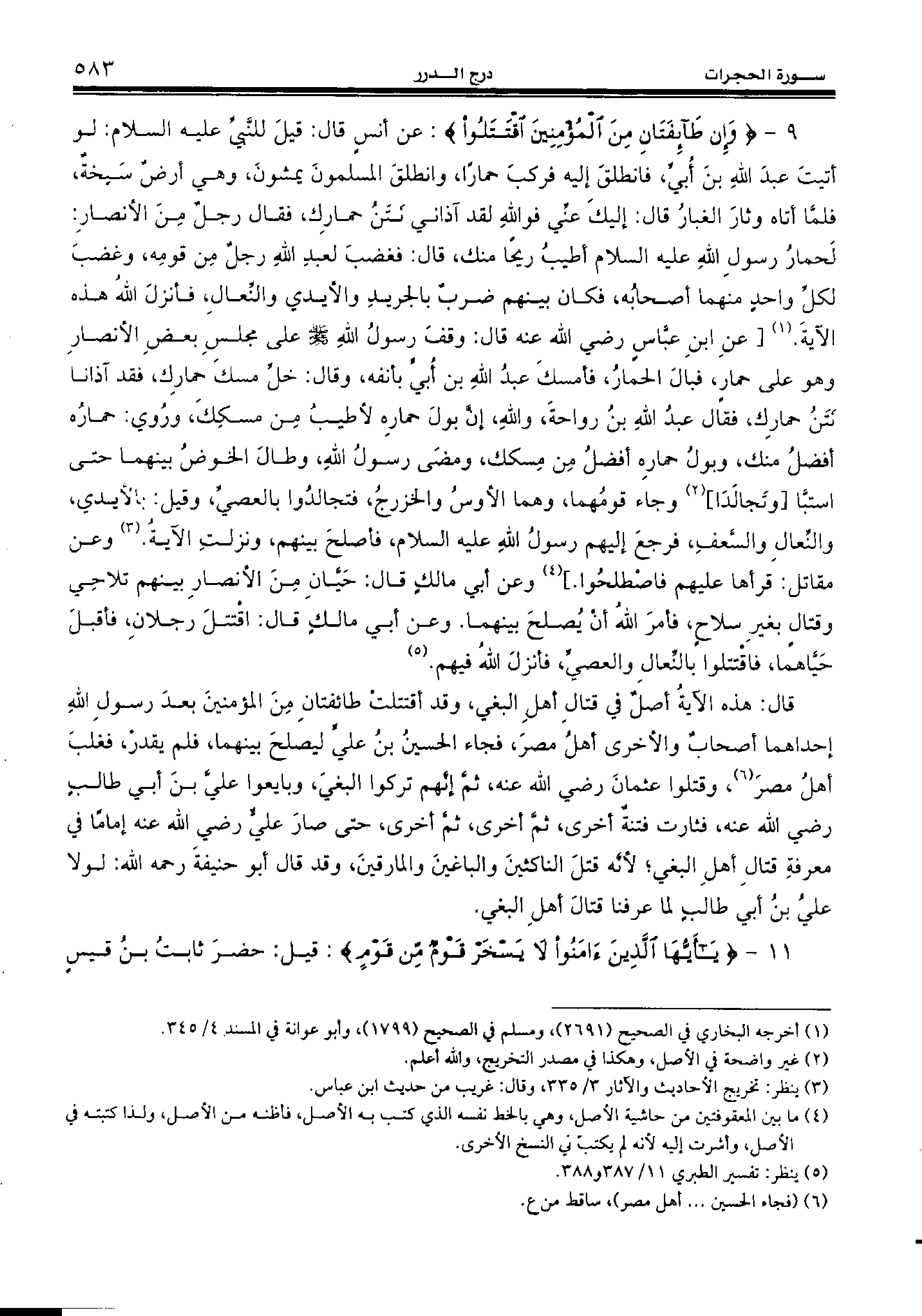 9 - {وَإِنْ طائِفَتانِ مِنَ الْمُؤْمِنِينَ اِقْتَتَلُوا:} عن أنس قال: قيل للنّبيّ عليه السّلام: لو أتيت عبد الله بن أبيّ، فانطلق إليه فركب حمارا، وانطلق المسلمون يمشون، وهي أرض سبخة، فلمّا أتاه وثار الغبار قال: إليك عنّي فو الله لقد آذاني نتن حمارك، فقال رجل من الأنصار: