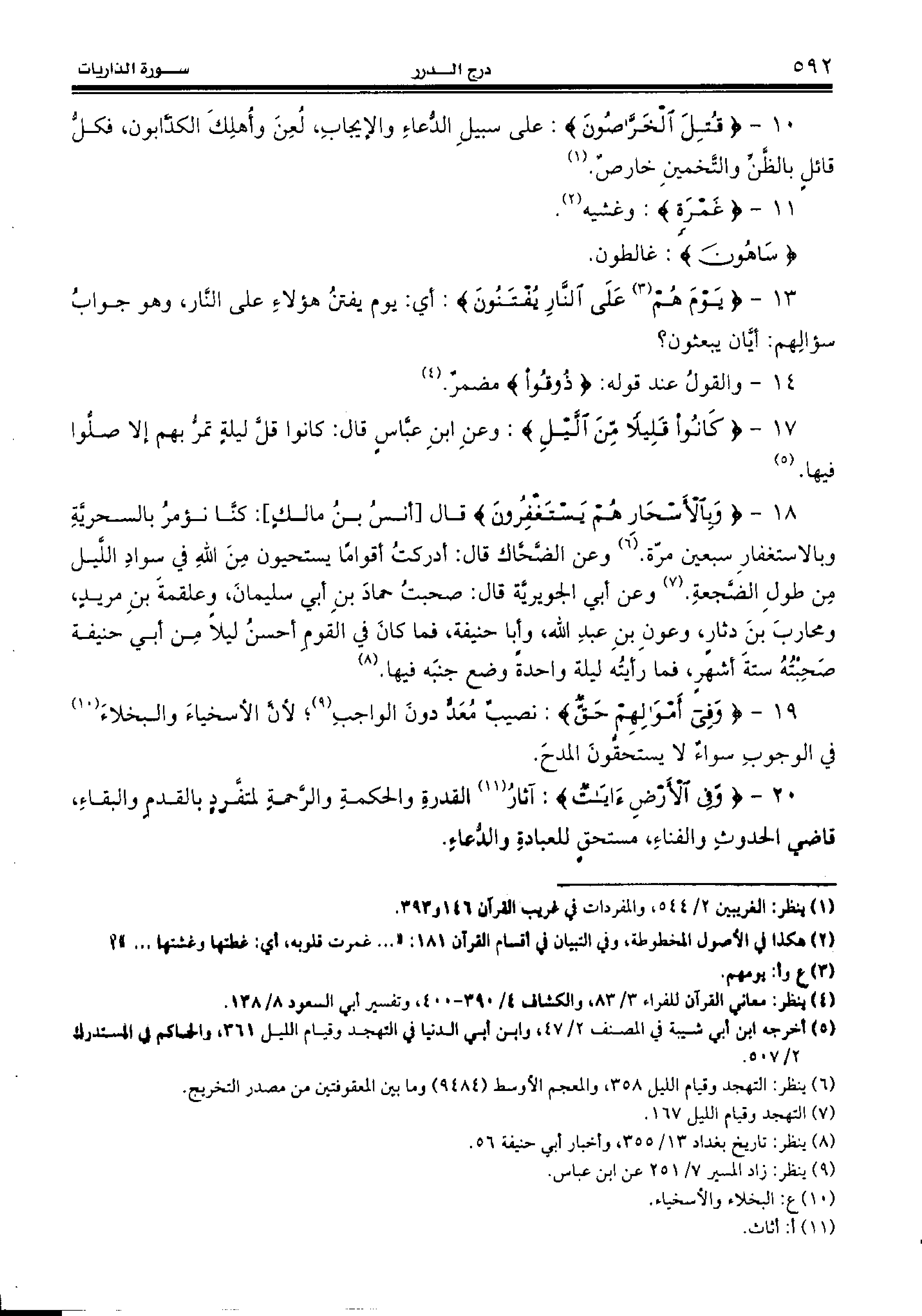 10 - {قُتِلَ الْخَرّاصُونَ:} على سبيل الدّعاء والإيجاب، لعن وأهلك الكذّابون، فكلّ قائل بالظّنّ والتّخمين خارص. (¬1)