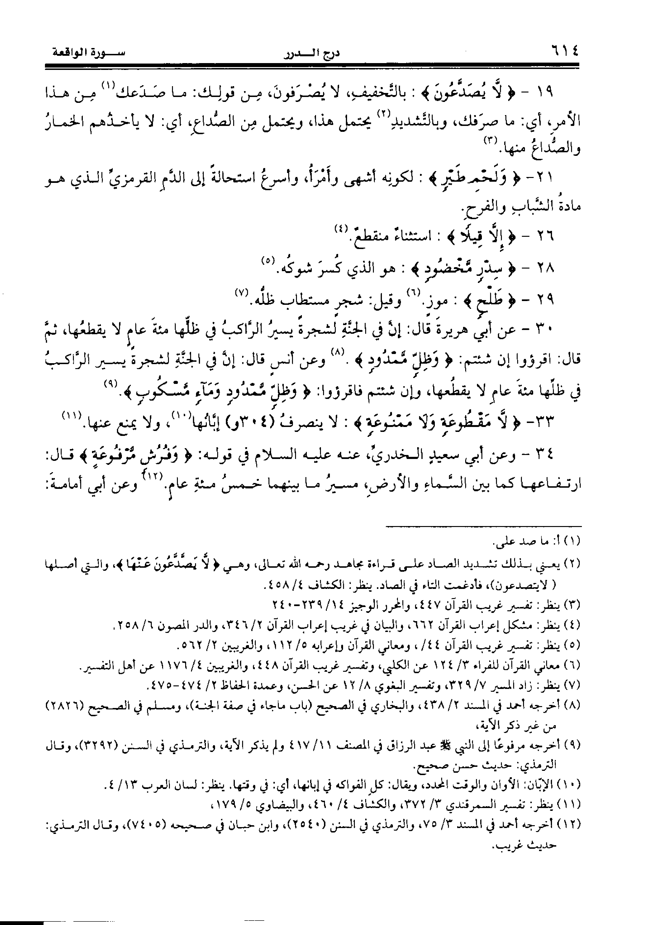 (¬2) يعني بذلك تشديد الصاد على قراءة مجاهد رحمه الله تعالى، وهي لا يُصَدَّعُونَ عَنْها، والتي أصلها (لا يتصدعون)، فأدغمت التاء في الصاد. ينظر: الكشاف 4/ 458.