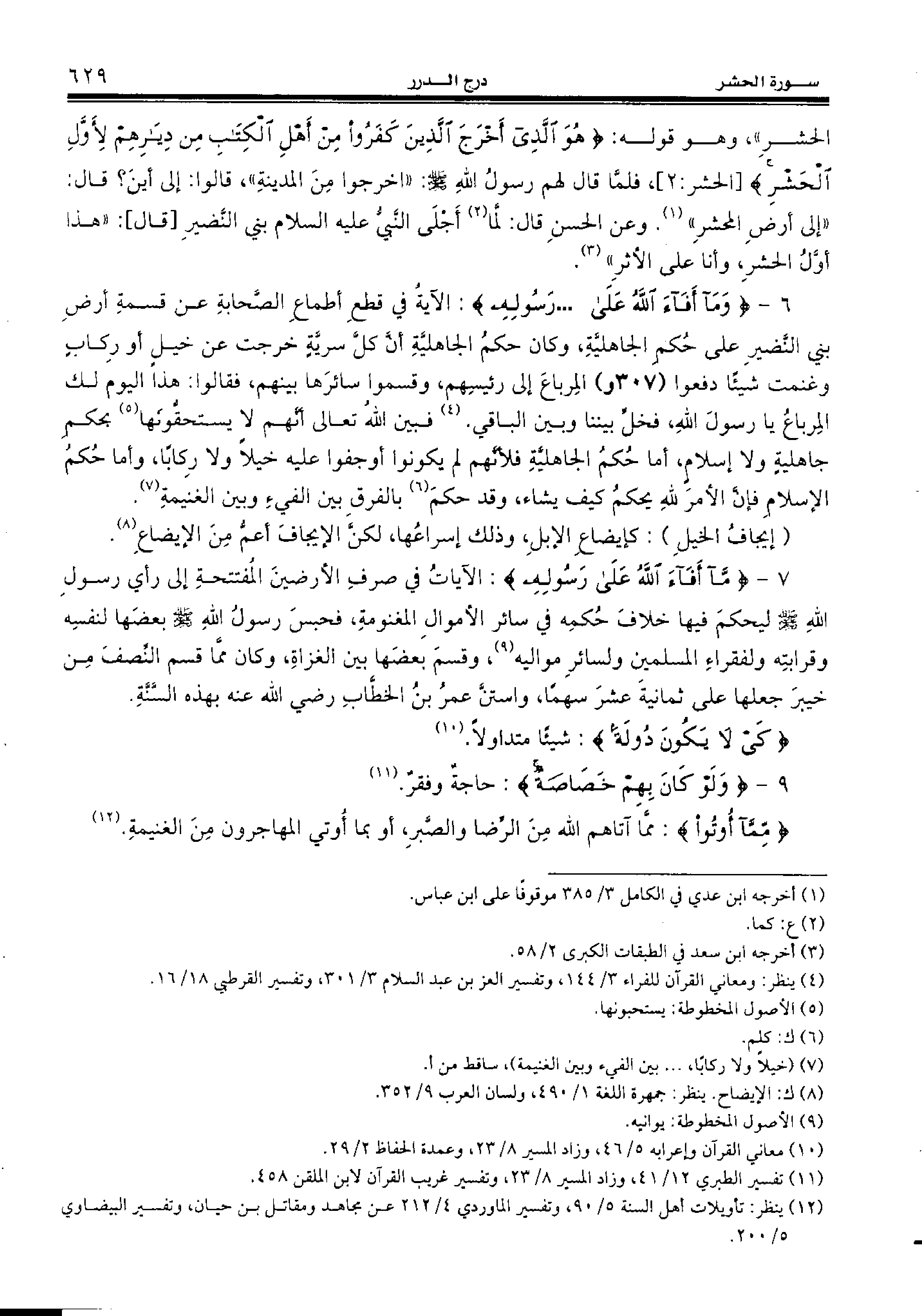 7 - {ما أَفاءَ اللهُ عَلى رَسُولِهِ:} الآيات في صرف الأرضين المفتتحة إلى رأي رسول الله صلّى الله عليه وسلّم ليحكم فيها خلاف حكمه في سائر الأموال المغنومة، فحبس رسول الله صلّى الله عليه وسلّم بعضها لنفسه وقرابته ولفقراء المسلمين ولسائر مواليه (¬9)، وقسم بعضها بين الغزاة، وكان ممّا قسم النّصف من خيبر جعلها على ثمانية عشر سهما، واستنّ عمر بن الخطّاب رضي الله عنه بهذه السّنّة.
