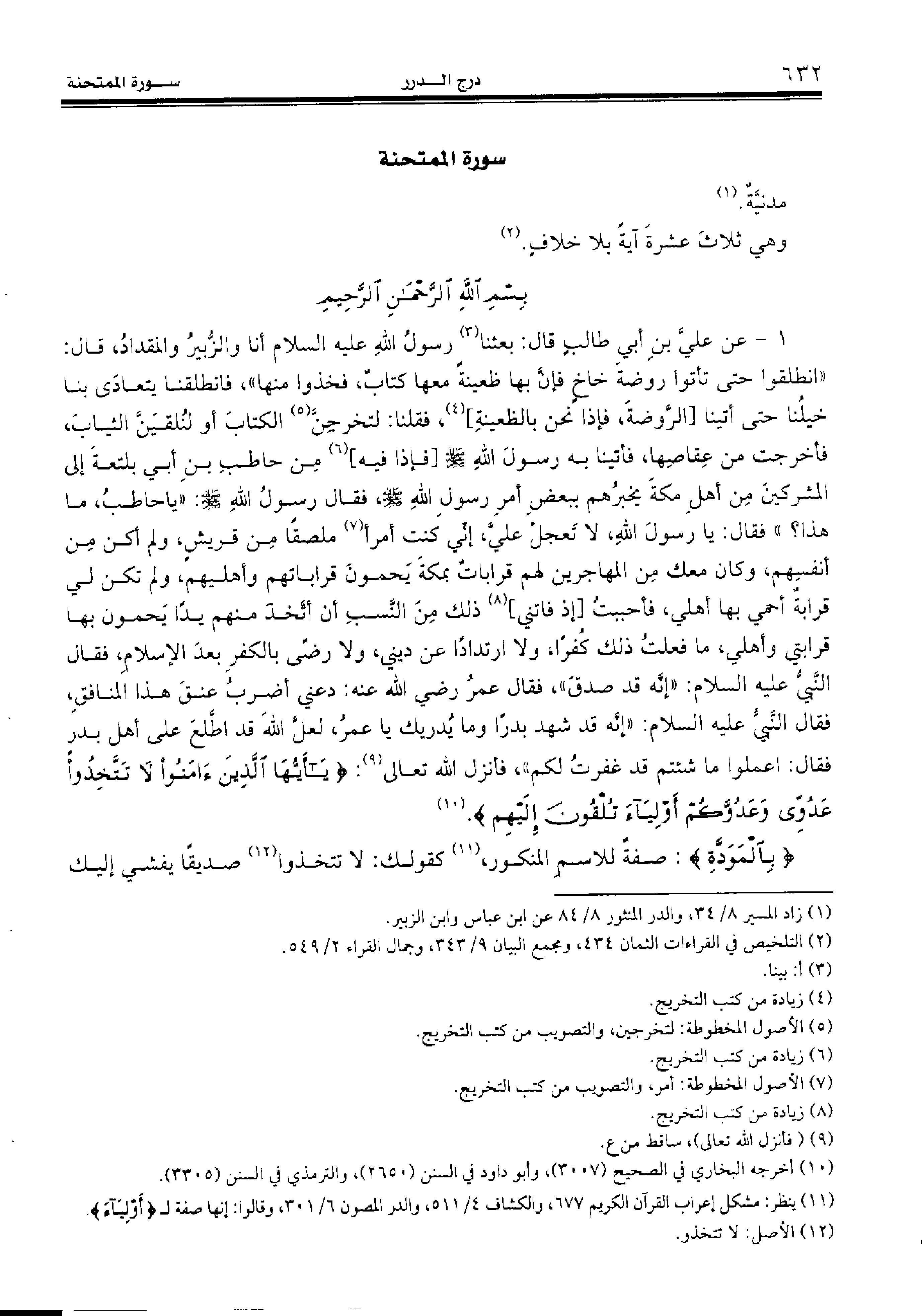 «انطلقوا حتى تأتوا روضة خاخ فإنّ بها ظعينة معها كتاب، فخذوا منها»، فانطلقنا يتعادى بنا خيلنا حتى أتينا [الرّوضة، فإذا نحن بالظعينة] (¬4)، فقلنا: لتخرجنّ (¬5) الكتاب أو لنلقينّ الثياب، فأخرجت من عقاصها، فأتينا به رسول الله صلّى الله عليه وسلّم [فإذا فيه] (¬6) من حاطب بن أبي بلتعة إلى المشركين من أهل مكة يخبرهم ببعض أمر رسول الله صلّى الله عليه وسلّم، فقال رسول الله صلّى الله عليه وسلّم: «يا حاطب، ما هذا؟» فقال: يا رسول الله، لا تعجل عليّ، إنّي كنت أمرأ (¬7) ملصقا من قريش، ولم أكن من أنفسهم، وكان معك من المهاجرين لهم قرابات بمكة يحمون قراباتهم وأهليهم، ولم تكن لي قرابة أحمي بها أهلي، فأحببت [إذ فاتني] (¬8) ذلك من النّسب أن أتّخذ منهم يدا يحمون بها قرابتي وأهلي، ما فعلت ذلك كفرا، ولا ارتدادا عن ديني، ولا رضى بالكفر بعد الإسلام، فقال النّبيّ عليه السّلام: «إنّه قد صدق»، فقال عمر رضي الله عنه: دعني أضرب عنق هذا المنافق، فقال النّبيّ عليه السّلام: «إنّه قد شهد بدرا وما يدريك يا عمر، لعلّ الله قد اطّلع على أهل بدر فقال: اعملوا ما شئتم قد غفرت لكم»، فأنزل الله تعالى (¬9): {يا أَيُّهَا الَّذِينَ آمَنُوا لا تَتَّخِذُوا عَدُوِّي وَعَدُوَّكُمْ أَوْلِياءَ تُلْقُونَ إِلَيْهِمْ.} (¬10)