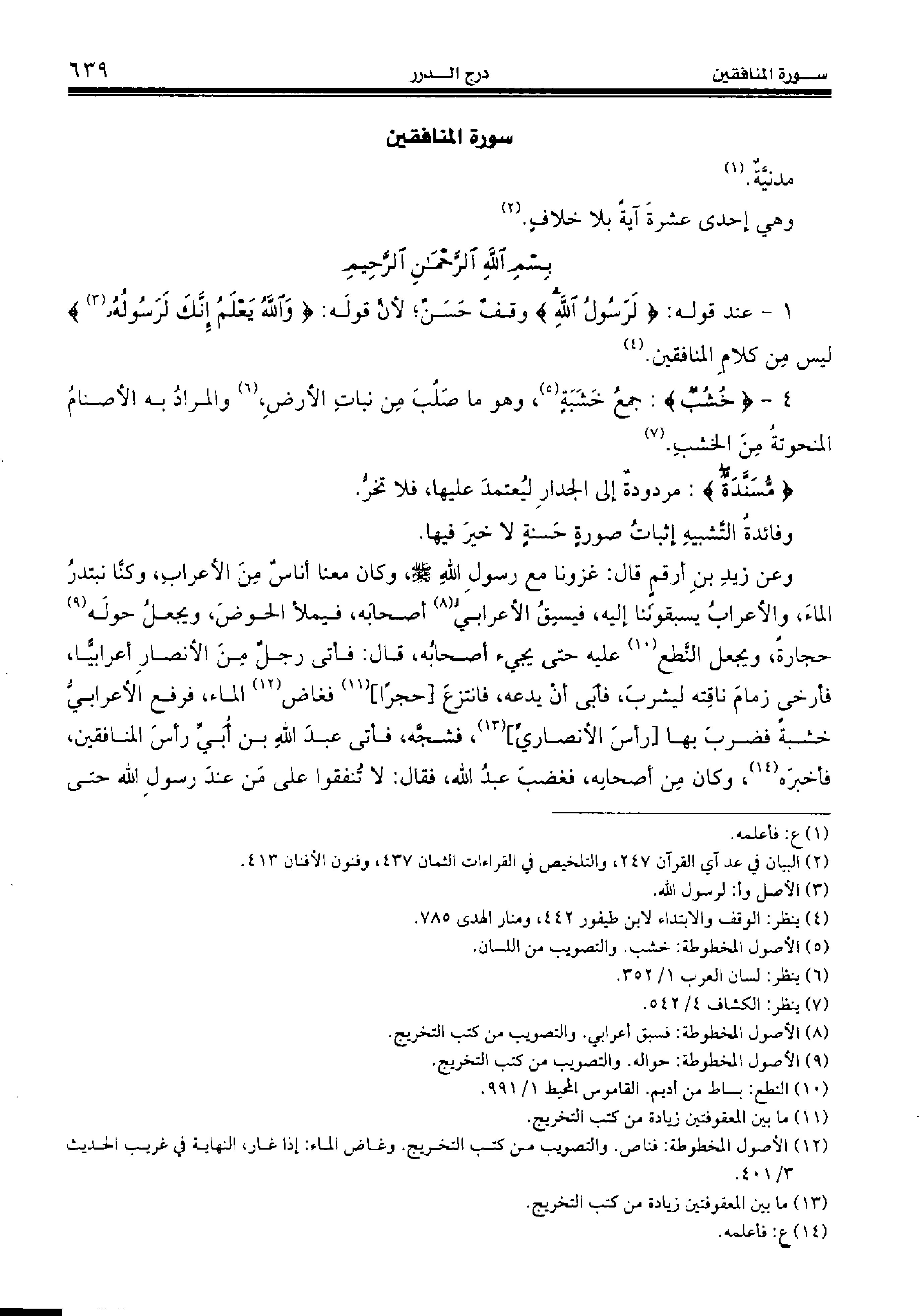وعن زيد بن أرقم قال: غزونا مع رسول الله صلّى الله عليه وسلّم، وكان معنا أناس من الأعراب، وكنّا نبتدر الماء، والأعراب يسبقوننا إليه، فيسبق الأعرابيّ (¬8) أصحابه، فيملأ الحوض، ويجعل حوله (¬9) حجارة، ويجعل النّطع (¬10) عليه حتى يجيء أصحابه، قال: فأتى رجل من الأنصار أعرابيّا، فأرخى زمام ناقته ليشرب، فأبى أن يدعه، فانتزع [حجرا] (¬11) فغاض (¬12) الماء، فرفع الأعرابيّ خشبة فضرب بها [رأس الأنصاريّ] (¬13)، فشجّه، فأتى عبد الله بن أبيّ رأس المنافقين، فأخبره (¬14)، وكان من أصحابه، فغضب عبد الله، فقال: لا تنفقوا على من عند رسول الله حتى