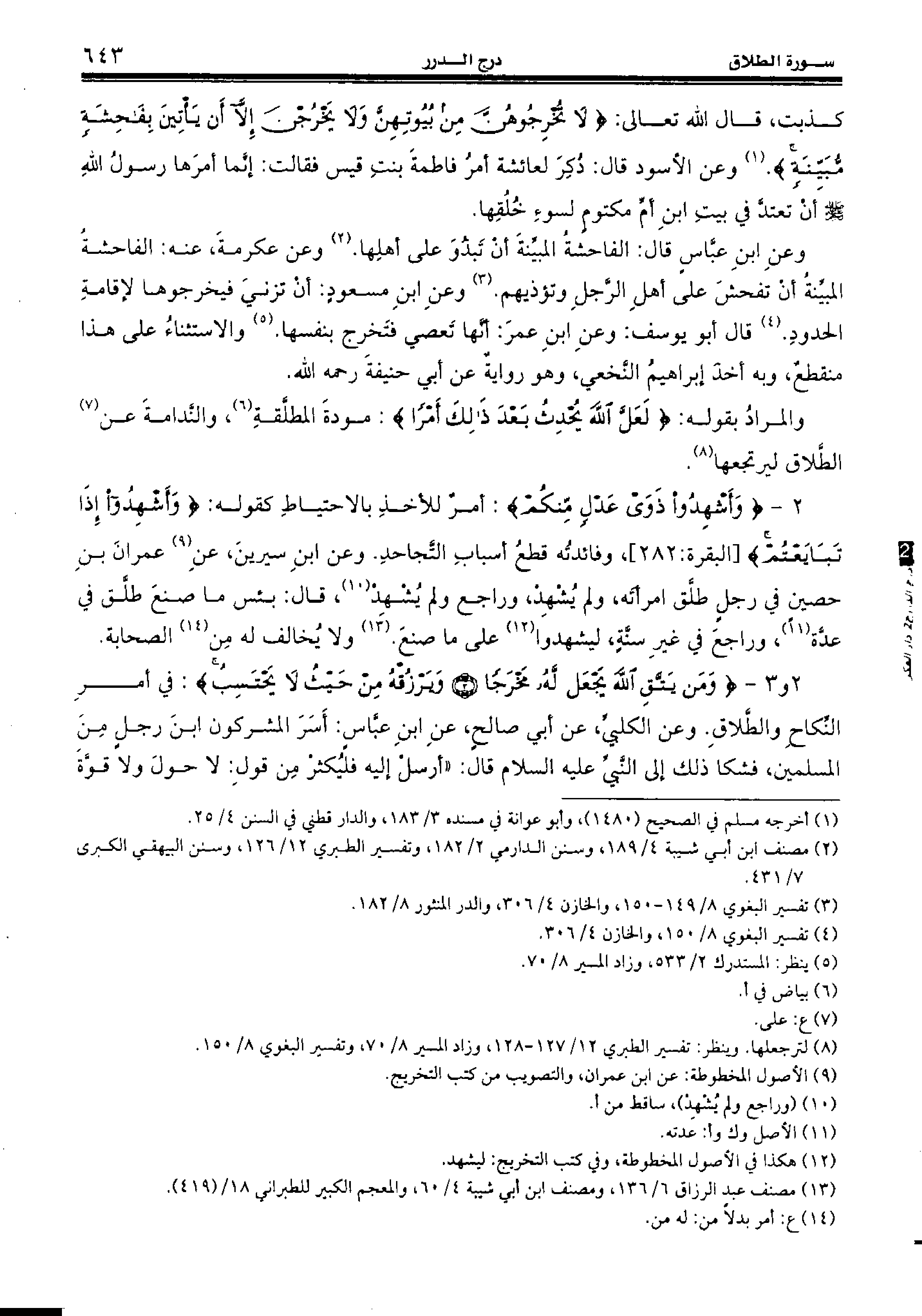 2 - {وَأَشْهِدُوا ذَوَيْ عَدْلٍ مِنْكُمْ:} أمر للأخذ بالاحتياط كقوله: {وَأَشْهِدُوا إِذا تَبايَعْتُمْ} [البقرة:282]، وفائدته قطع أسباب التّجاحد. وعن ابن سيرين، عن (¬9) عمران بن حصين في رجل طلّق امرأته، ولم يشهد، وراجع ولم يشهد (¬10)، قال: بئس ما صنع طلّق في عدّة (¬11)، وراجع في غير سنّة، ليشهدوا (¬12) على ما صنع. (¬13) ولا يخالف له من (¬14) الصحابة.