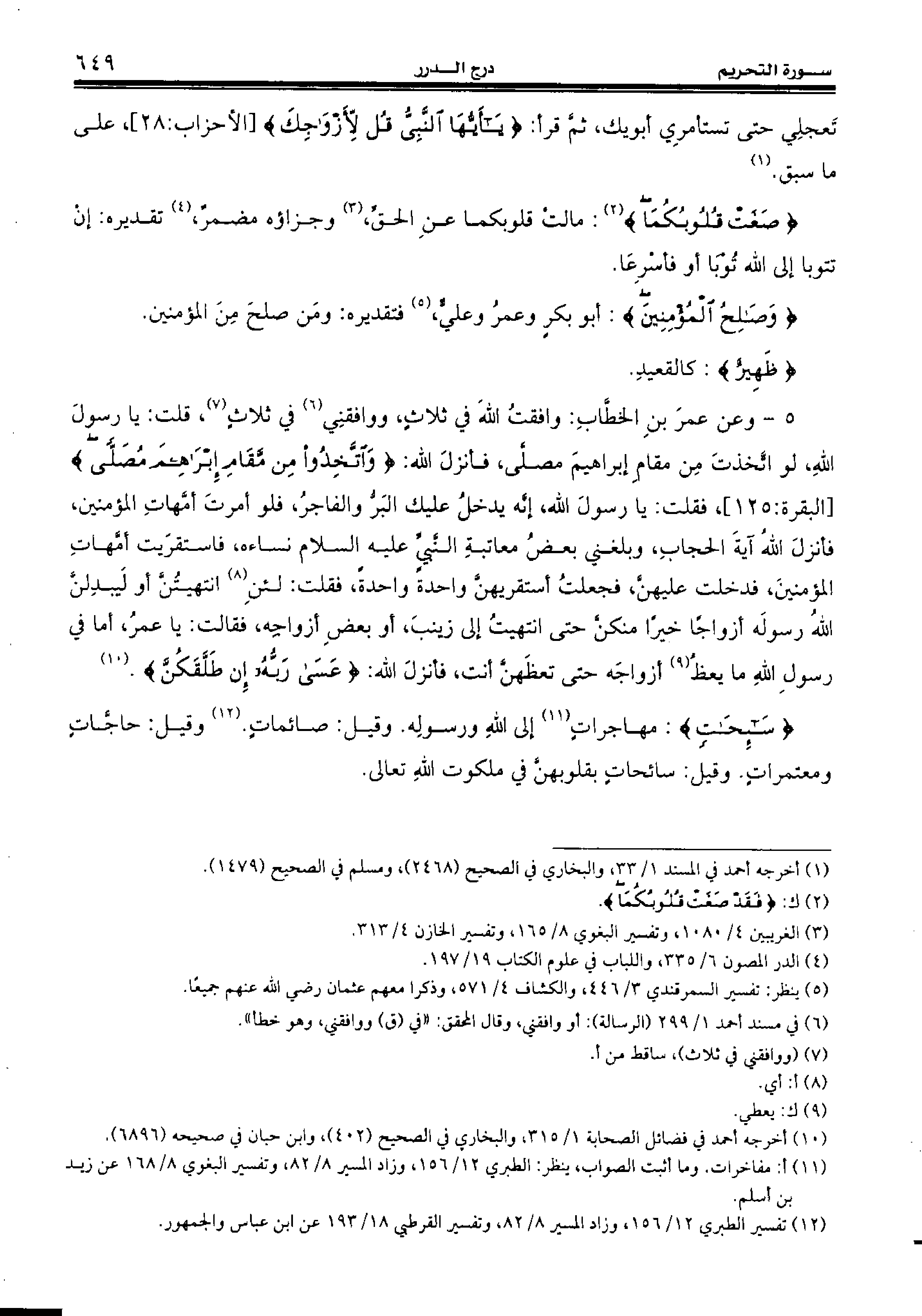 5 - وعن عمر بن الخطّاب: وافقت الله في ثلاث، ووافقني (¬6) في ثلاث (¬7)، قلت: يا رسول الله، لو اتّخذت من مقام إبراهيم مصلّى، فأنزل الله: {وَاِتَّخِذُوا مِنْ مَقامِ إِبْراهِيمَ مُصَلًّى} [البقرة:125]، فقلت: يا رسول الله، إنّه يدخل عليك البرّ والفاجر، فلو أمرت أمّهات المؤمنين، فأنزل الله آية الحجاب، وبلغني بعض معاتبة النّبيّ عليه السّلام نساءه، فاستقريت أمّهات المؤمنين، فدخلت عليهنّ، فجعلت أستقريهنّ واحدة واحدة، فقلت: لئن (¬8) انتهيتنّ أو ليبدلنّ الله رسوله أزواجا خيرا منكنّ حتى انتهيت إلى زينب، أو بعض أزواجه، فقالت: يا عمر، أما في رسول الله ما يعظ (¬9) أزواجه حتى تعظهنّ أنت، فأنزل الله: {عَسى رَبُّهُ إِنْ طَلَّقَكُنَّ.} (¬10)