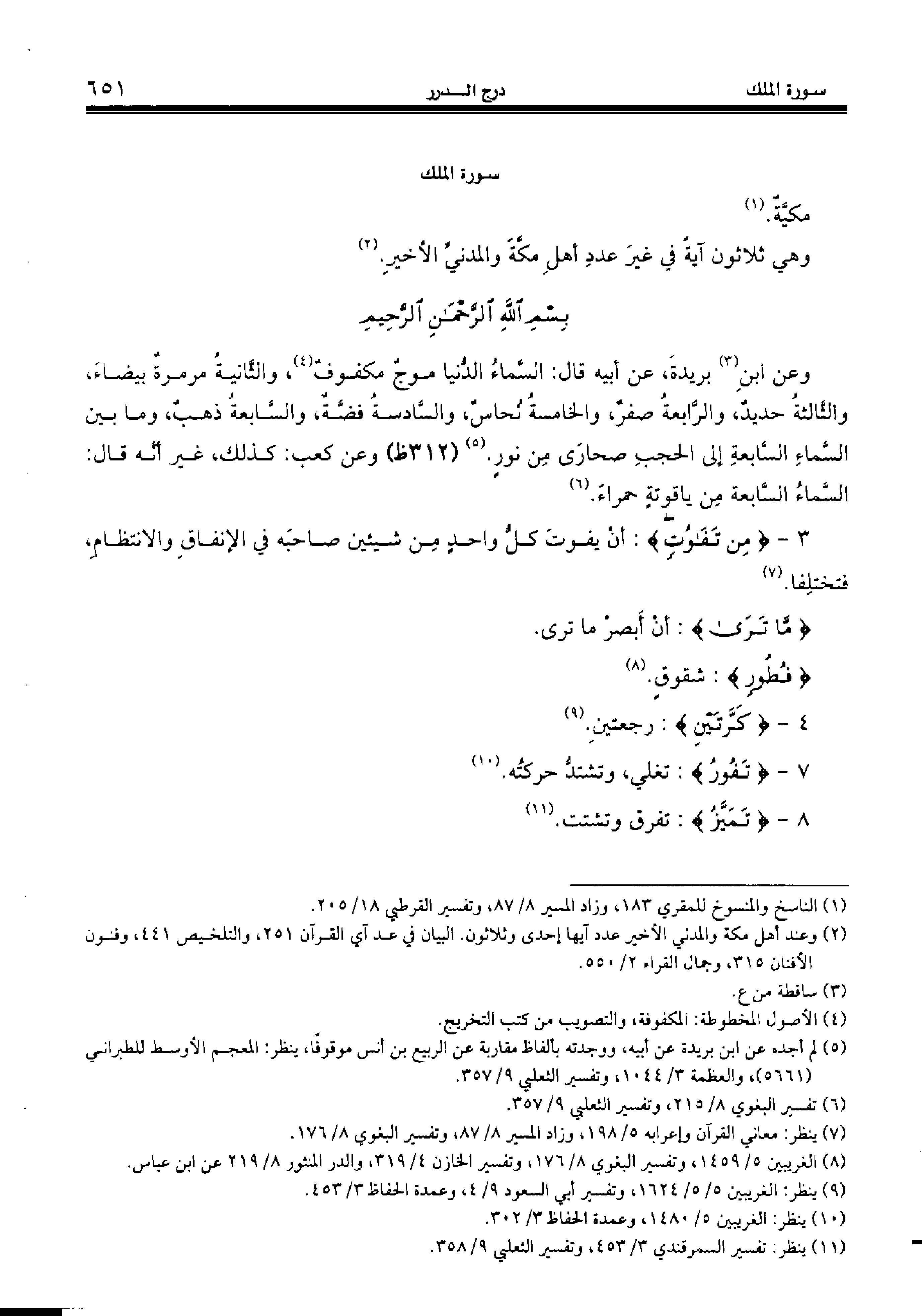 بسم الله الرّحمن الرّحيم وعن ابن (¬3) بريدة، عن أبيه قال: السّماء الدّنيا موج مكفوف (¬4)، والثّانية مرمرة بيضاء، والثّالثة حديد، والرّابعة صفر، والخامسة نحاس، والسّادسة فضّة، والسّابعة ذهب، وما بين السّماء السّابعة إلى الحجب صحارى من نور. (¬5) (312 ظ) وعن كعب: كذلك، غير أنّه قال: