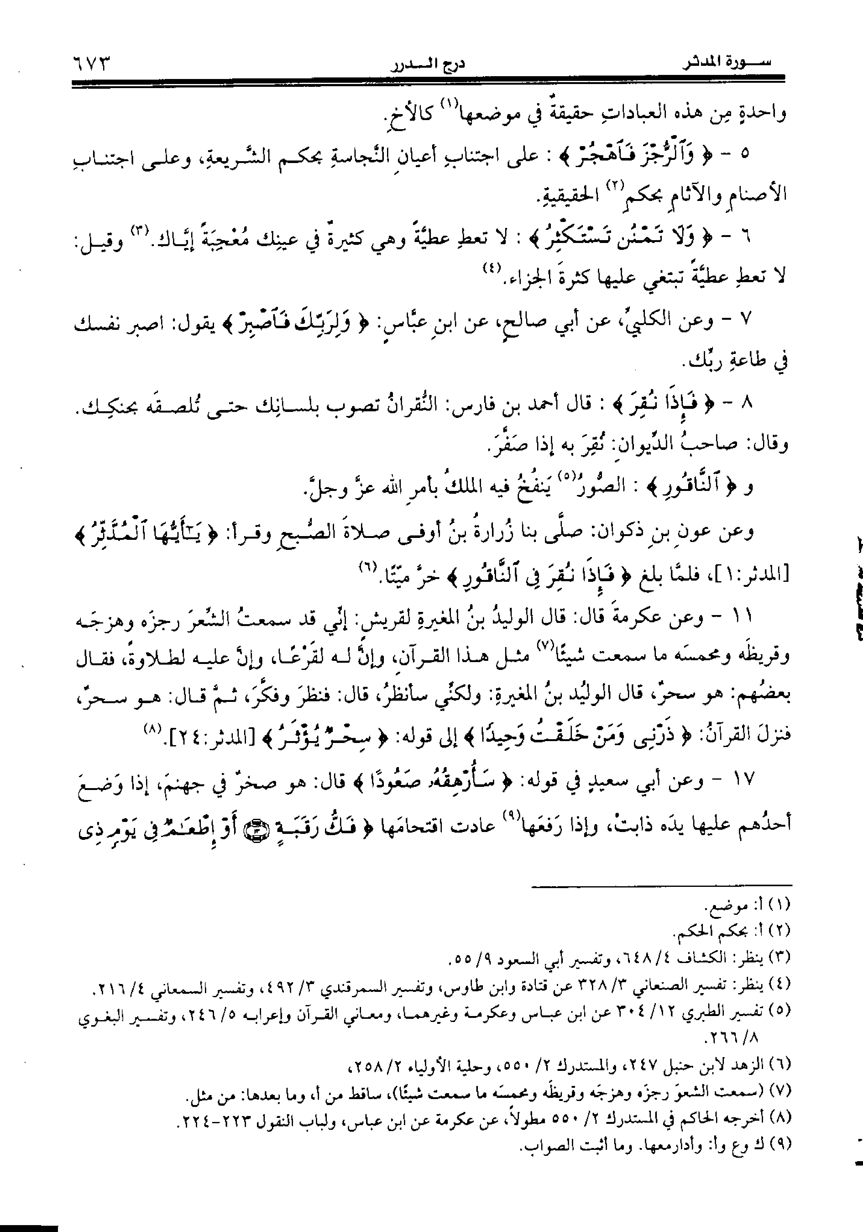5 - {وَالرُّجْزَ فَاهْجُرْ:} على اجتناب أعيان النّجاسة بحكم الشّريعة، وعلى اجتناب الأصنام والآثام بحكم (¬2) الحقيقية.
