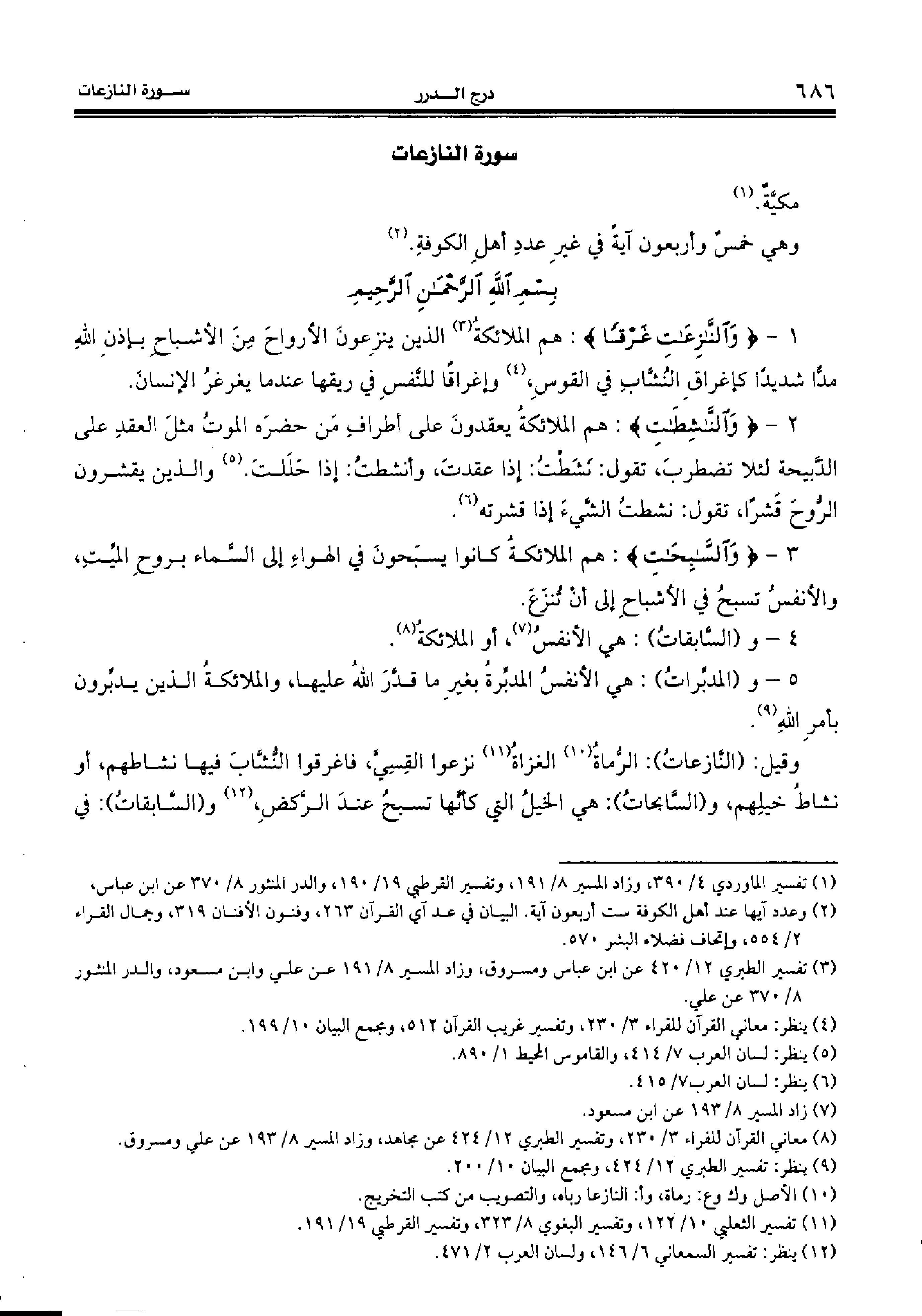 1 - {وَالنّازِعاتِ غَرْقاً:} هم الملائكة (¬3) الذين ينزعون الأرواح من الأشباح بإذن الله مدّا شديدا كإغراق النشّاب في القوس، (¬4) وإغراقا للنّفس في ريقها عند ما يغرغر الإنسان.