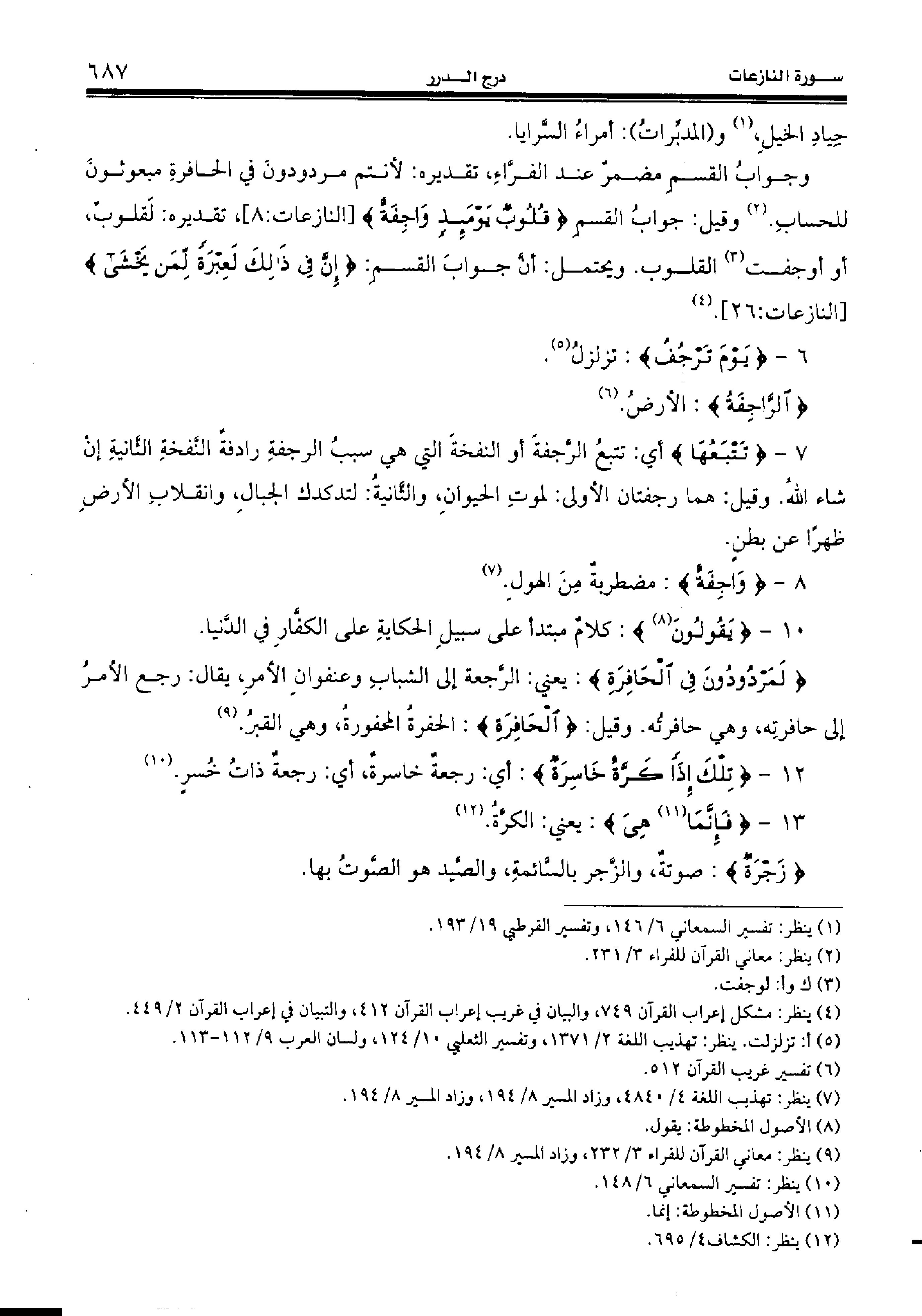 وجواب القسم مضمر عند الفرّاء، تقديره: لأنتم مردودون في الحافرة مبعوثون للحساب. (¬2) وقيل: جواب القسم {قُلُوبٌ يَوْمَئِذٍ واجِفَةٌ} [النازعات:8]، تقديره: لقلوب، أو أوجفت (¬3) القلوب. ويحتمل: أنّ جواب القسم: {إِنَّ فِي ذلِكَ لَعِبْرَةً لِمَنْ يَخْشى} [النازعات:26]. (¬4)